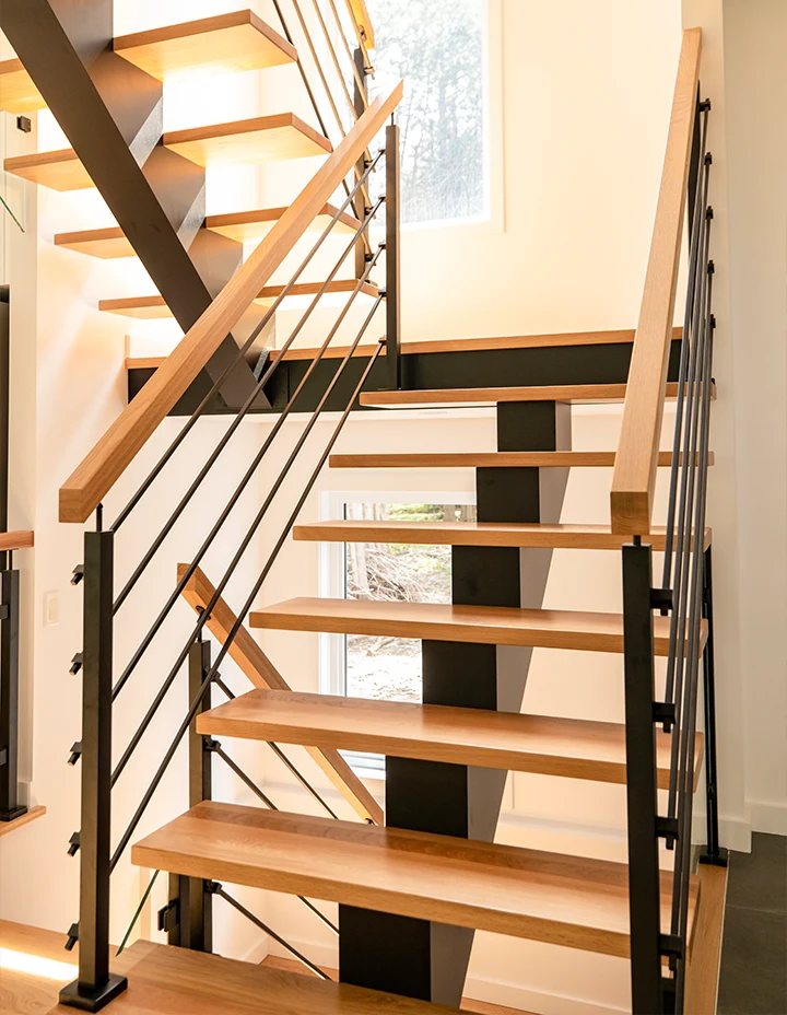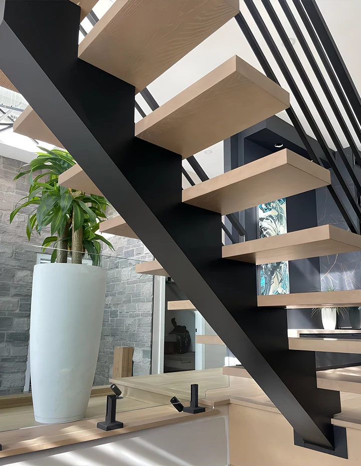 The Seattle stairs combine steel integrity with invisible craftsmanship. Built around a central spine, each step is engineered for silent impact.