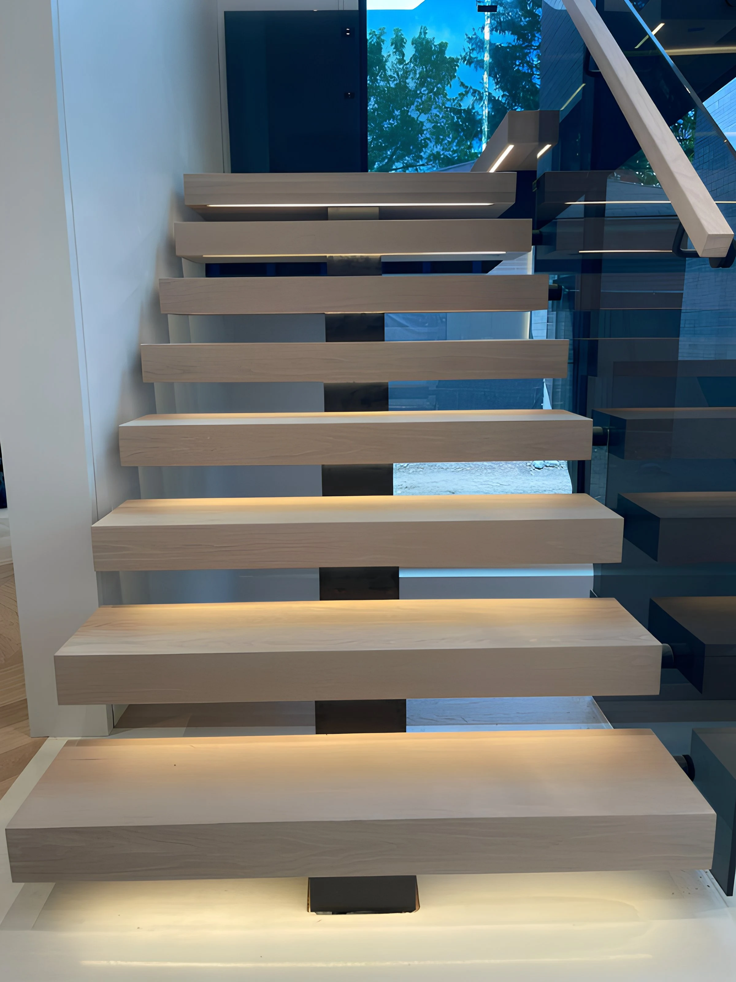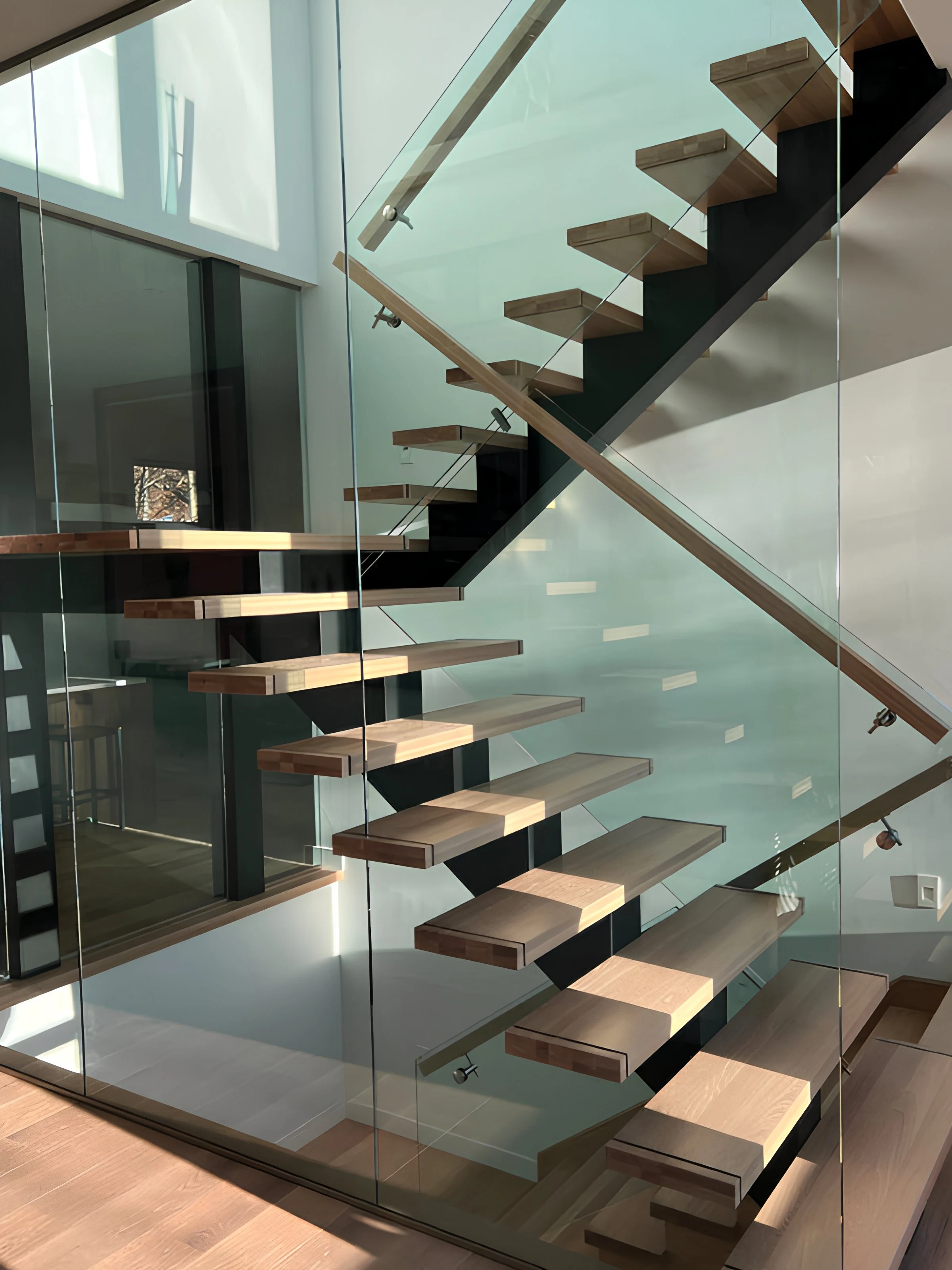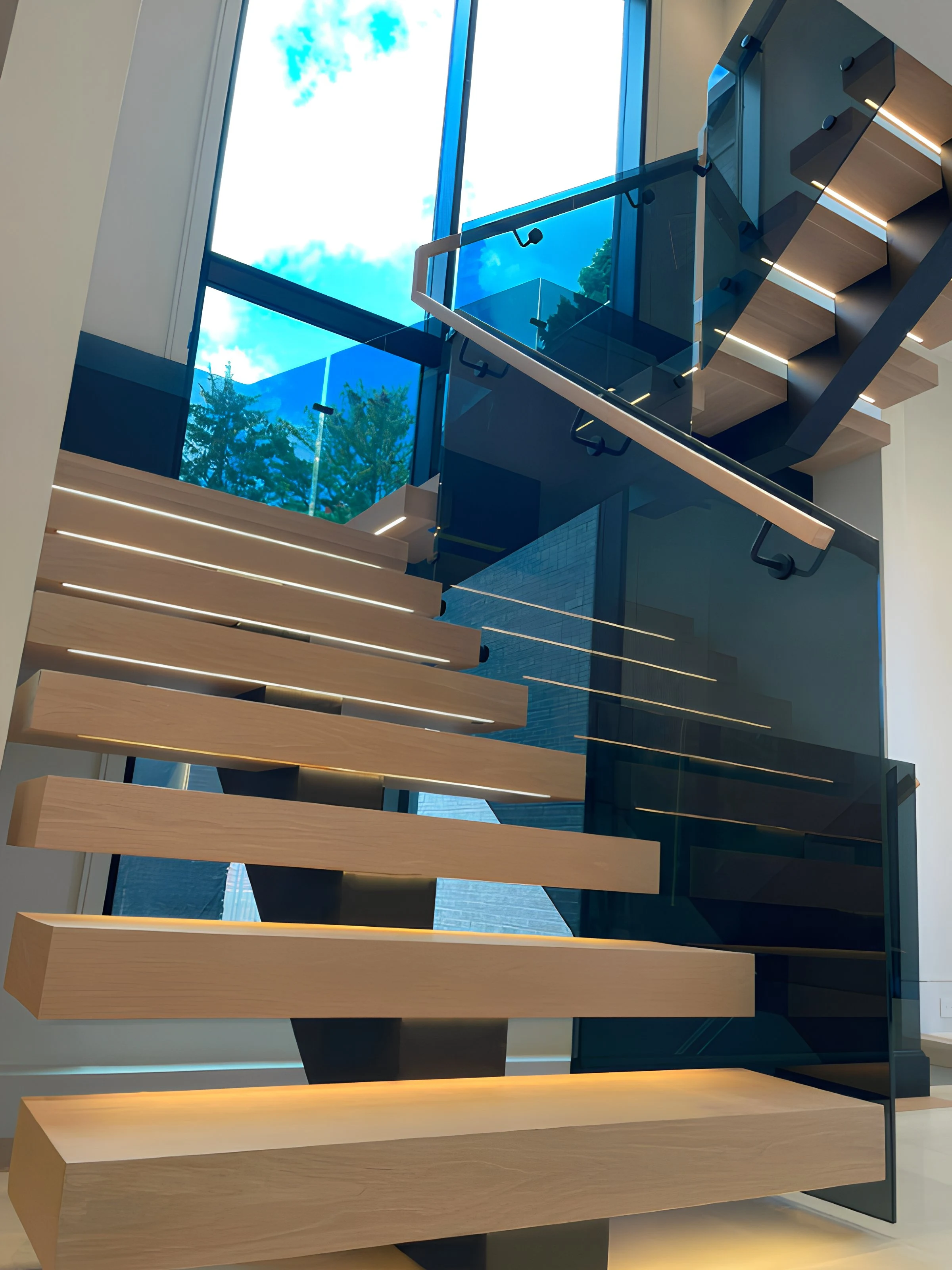 The Seattle stairs combine steel integrity with invisible craftsmanship. Built around a central spine, each step is engineered for silent impact.