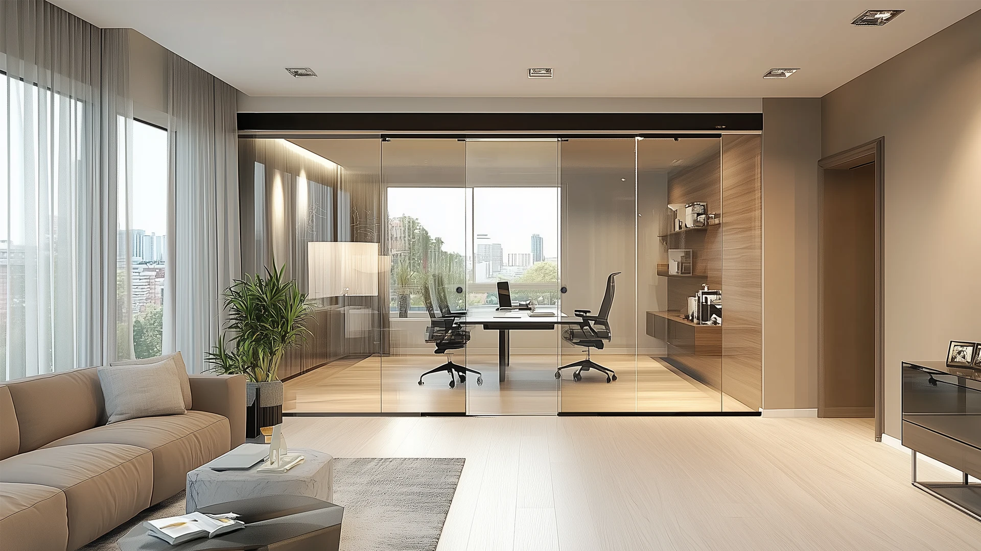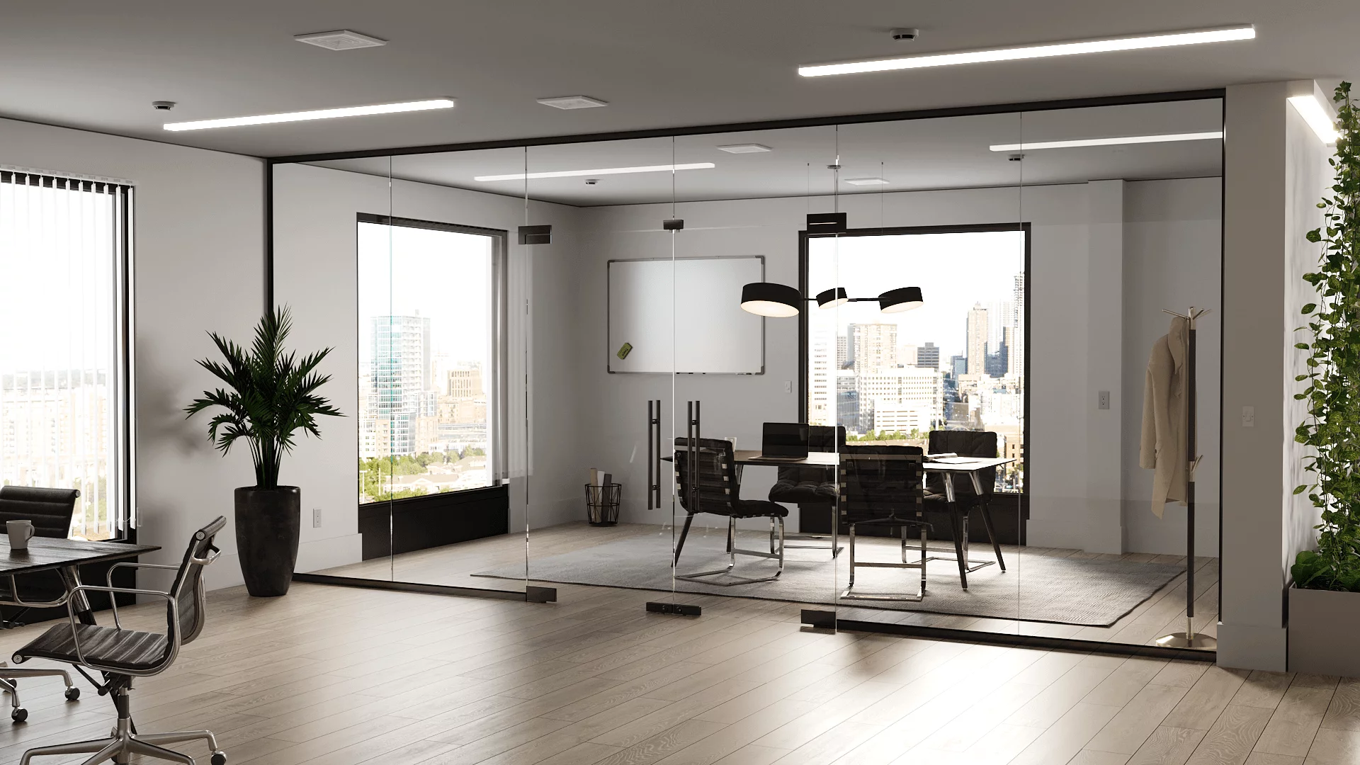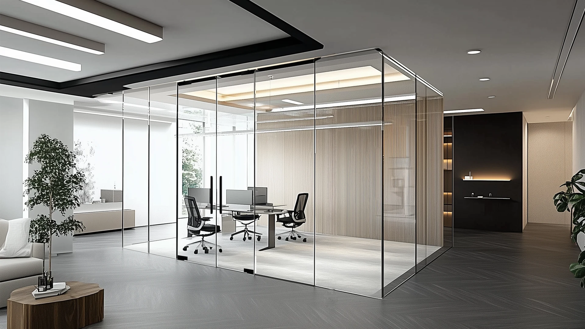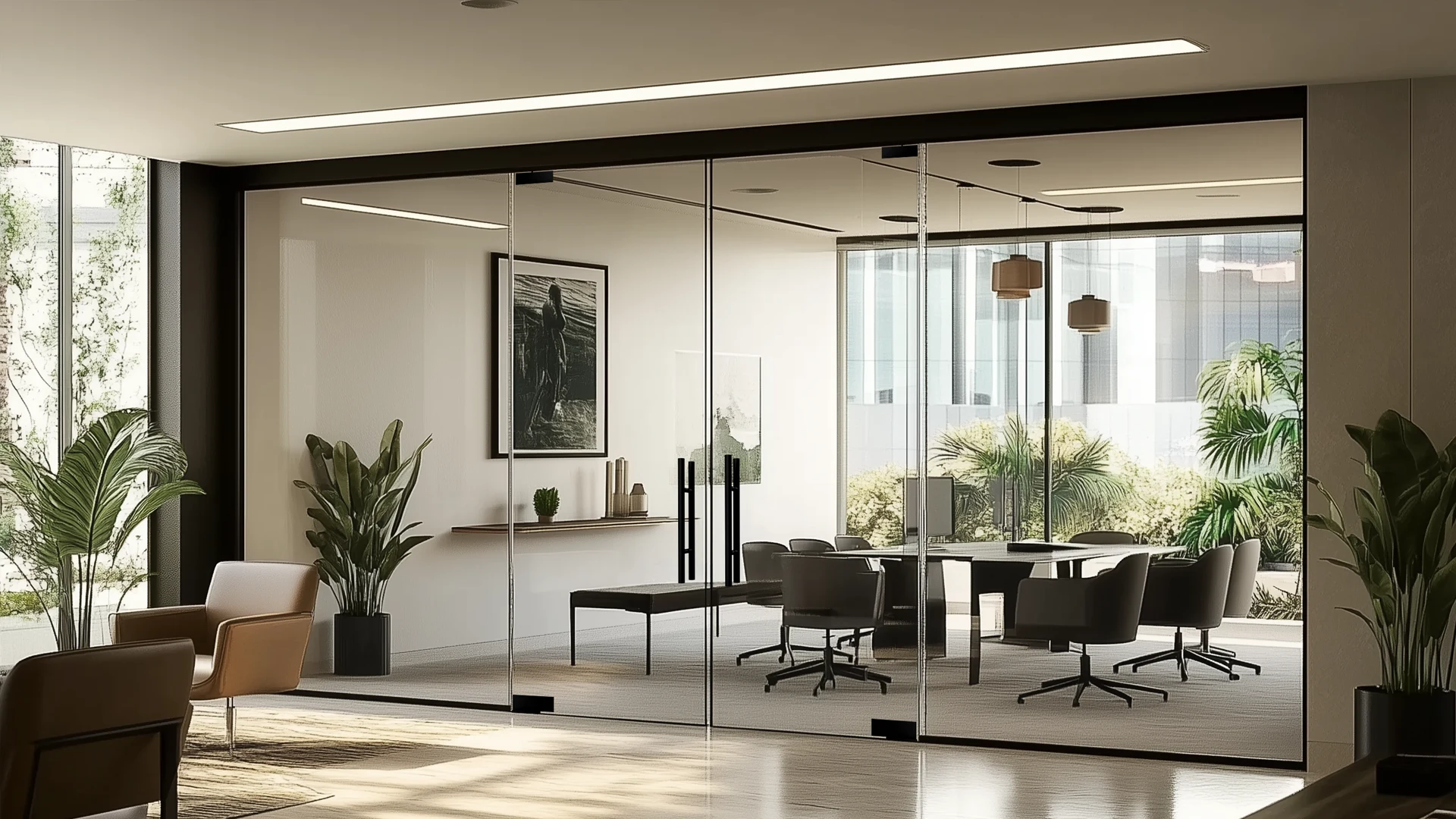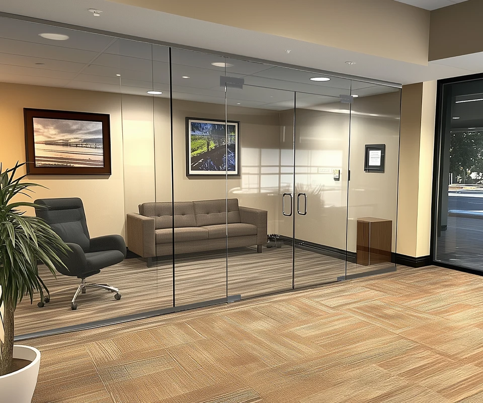 These glass partitions offer a truly modern aesthetic, featuring expansive glass panels without any bulky frames.