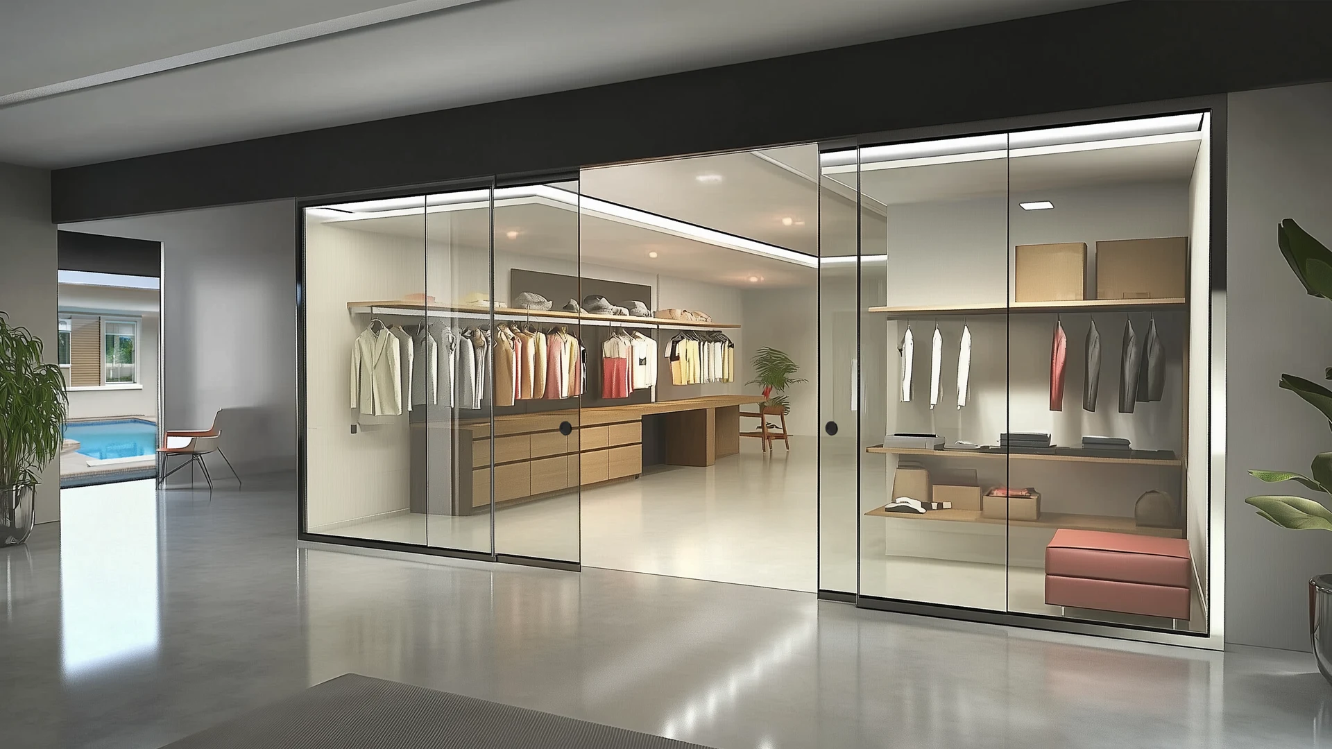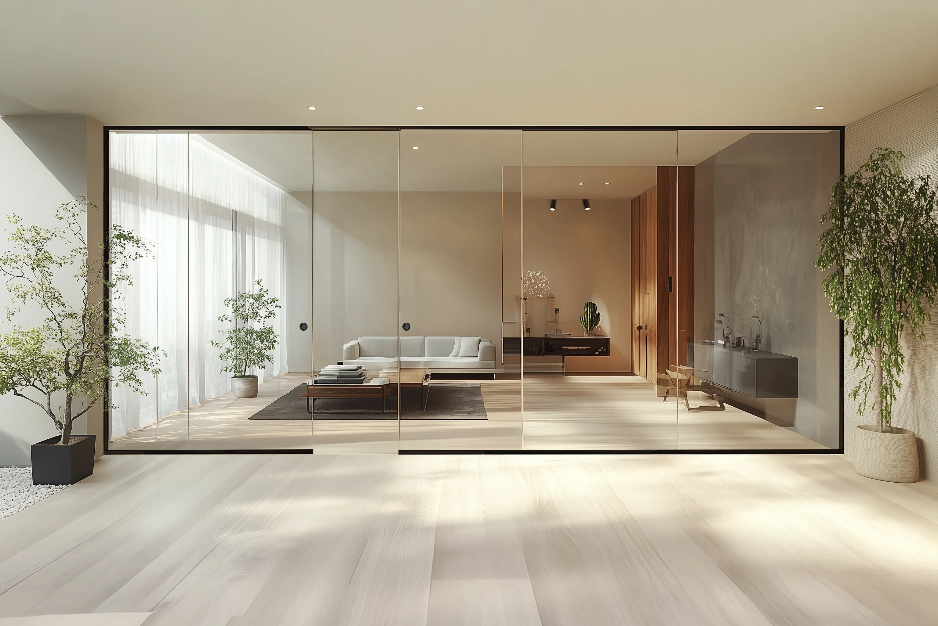 A top-hung frameless sliding partition with polished edges, ideal for those who desire a light and simple look for their minimalist interiors.