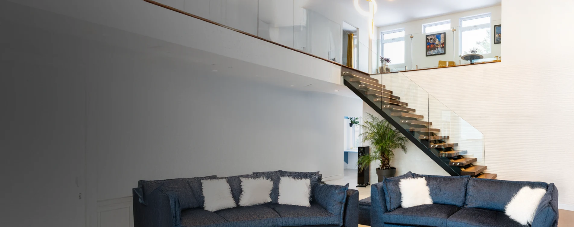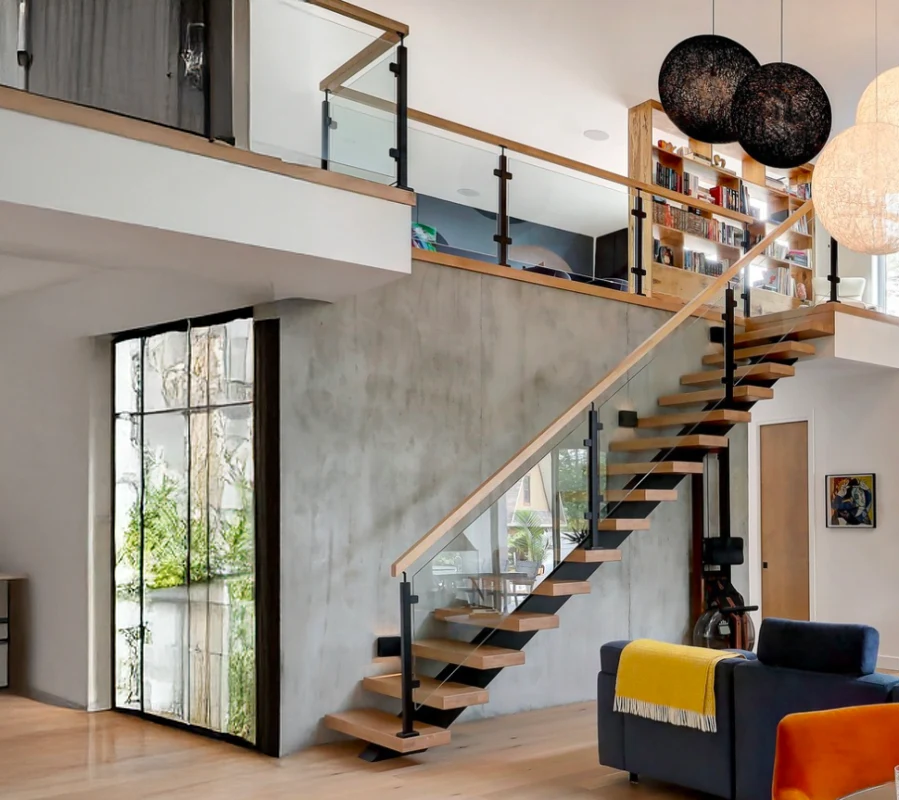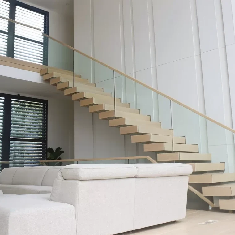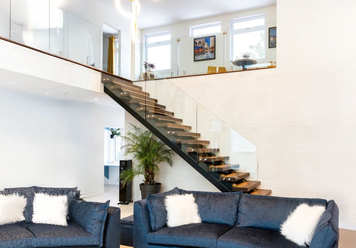 Sleek and long-lasting glass railing systems designed to fit staircases of various layouts. These glass railings offer a contemporary and upscale appearance that seamlessly integrates with any interior decor.