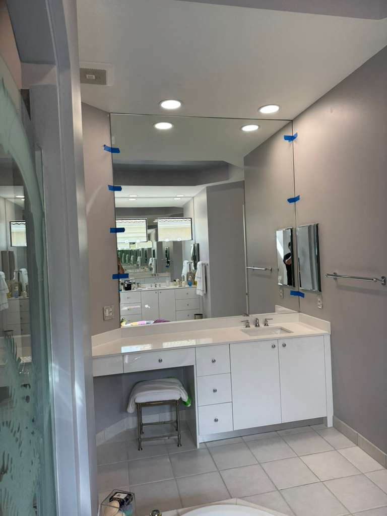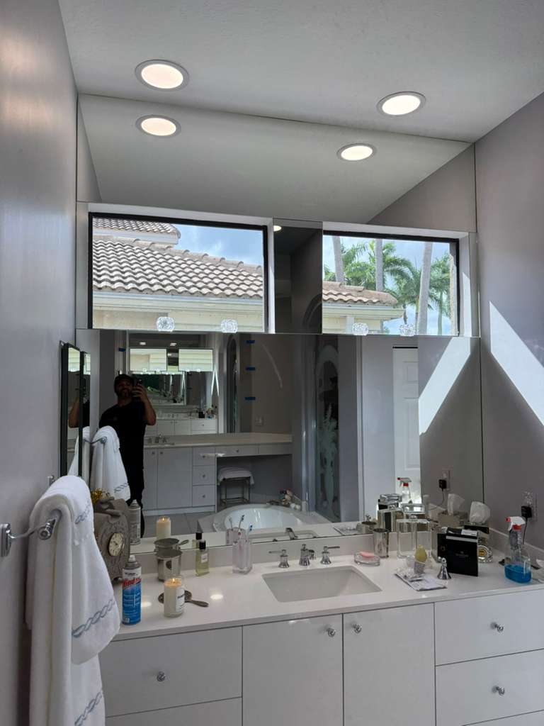 This West Palm Beach project included the installation of two custom vanity mirrors, both crafted from ¼” Clear 1st Grade Mirror for exceptional reflection quality and a bright, open feel. Each piece was precision-cut and professionally installed directly onto the wall using premium adhesive for a seamless, frameless look that enhances the space’s elegance and depth.