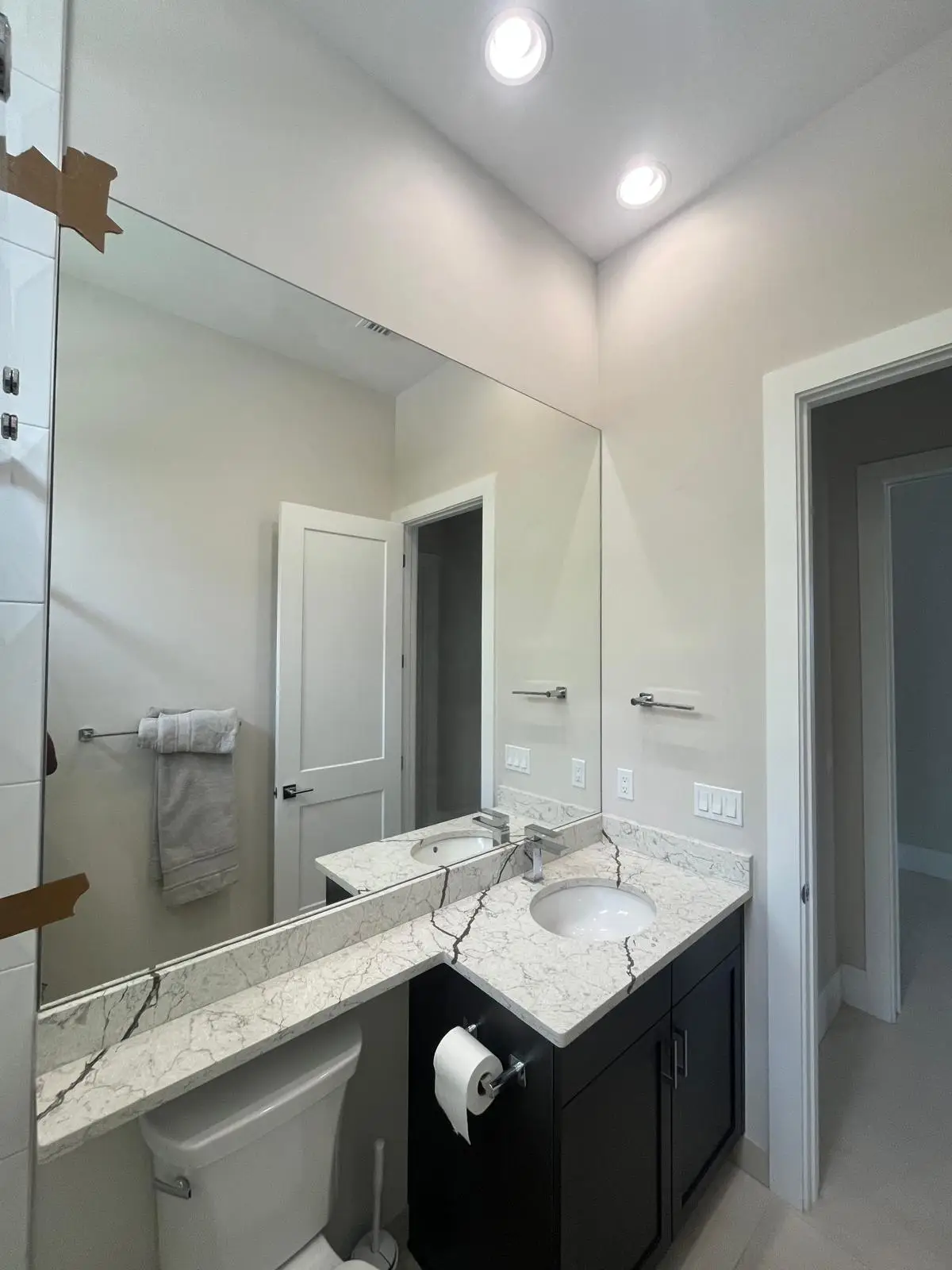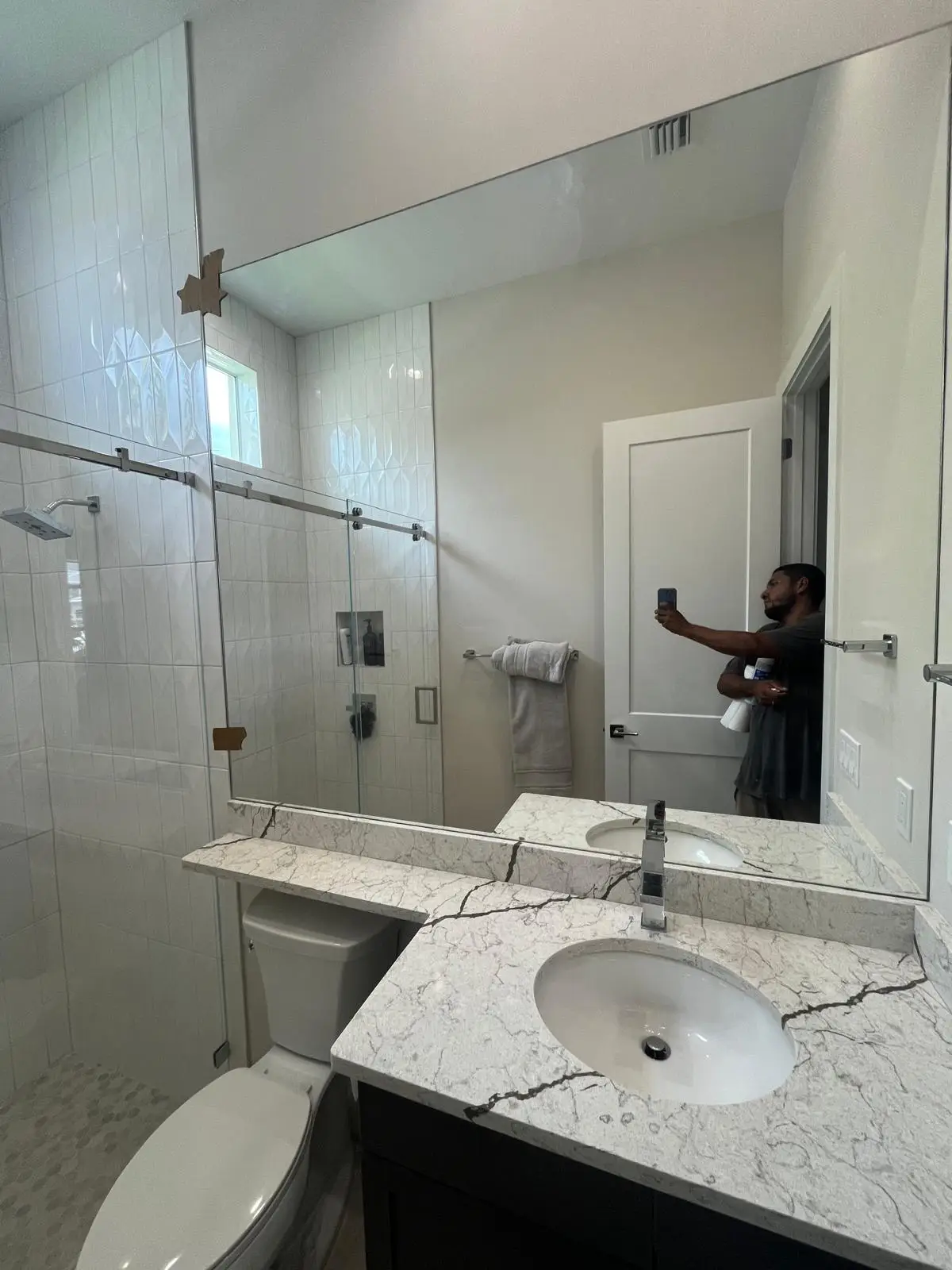 This project in Palm Beach Gardens, FL, involved the removal of an existing vanity mirror and the installation of a new custom ¼” clear 1st grade mirror. To ensure both durability and a flawless appearance, UltraMirror glass was selected for its superior reflection quality and resistance to common issues like black edge. The installation was carried out with specialized products including Mirror Sealant, which provides long-term edge protection, and Mirro-Mastic®, a high-performance adhesive designed for secure and lasting application. Together, these elements created a refreshed, elegant finish that elevates the bathroom’s overall aesthetic while ensuring long-lasting performance.