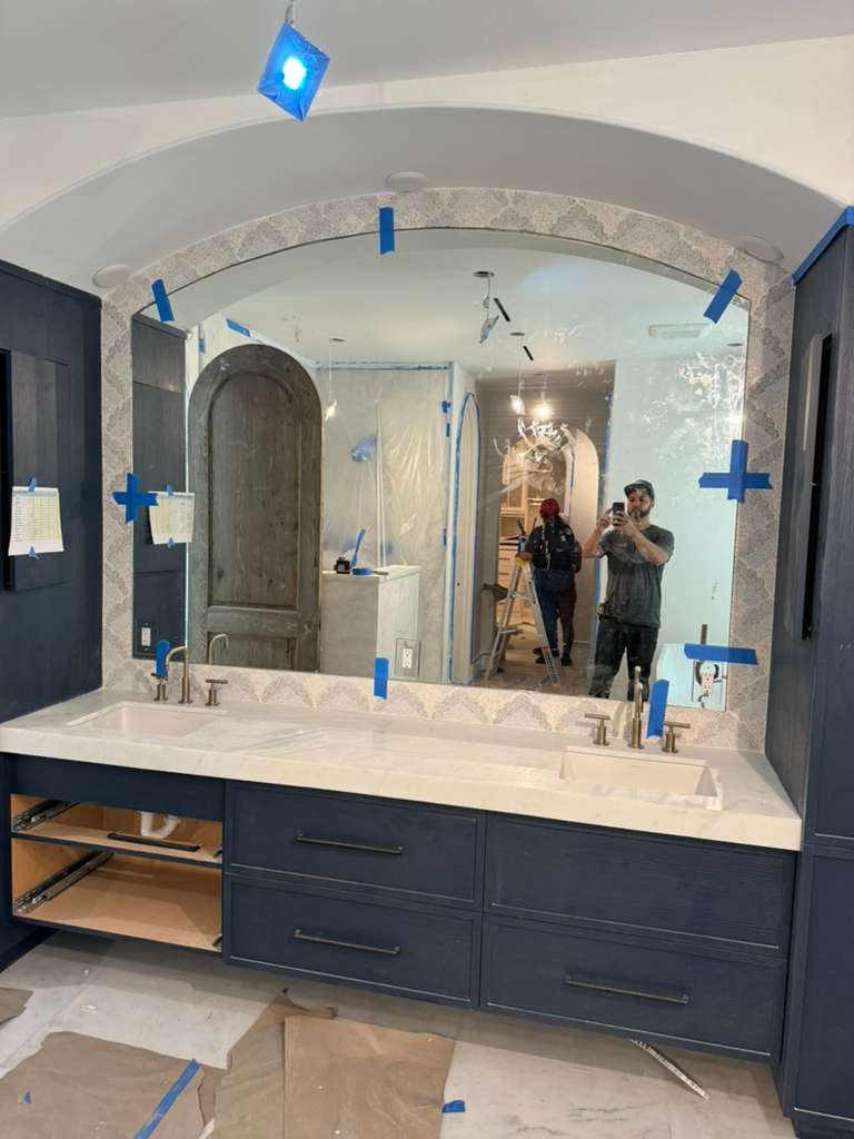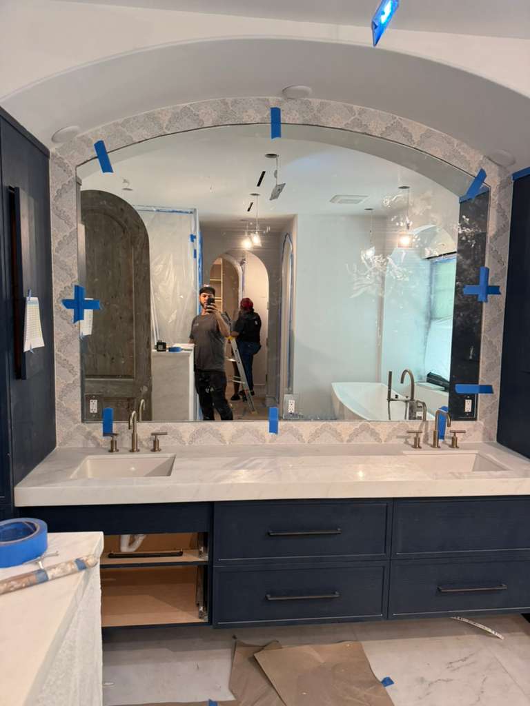 Crafted using UltraMirror glass, this installation ensures long-lasting brilliance and resistance to corrosion or edge deterioration. The mirrors were sealed with Mirror Sealant to prevent “black edge” over time and adhered using Mirro-Mastic®, a professional-grade adhesive designed for strength and flexibility without brittleness.