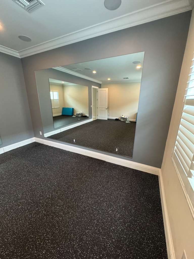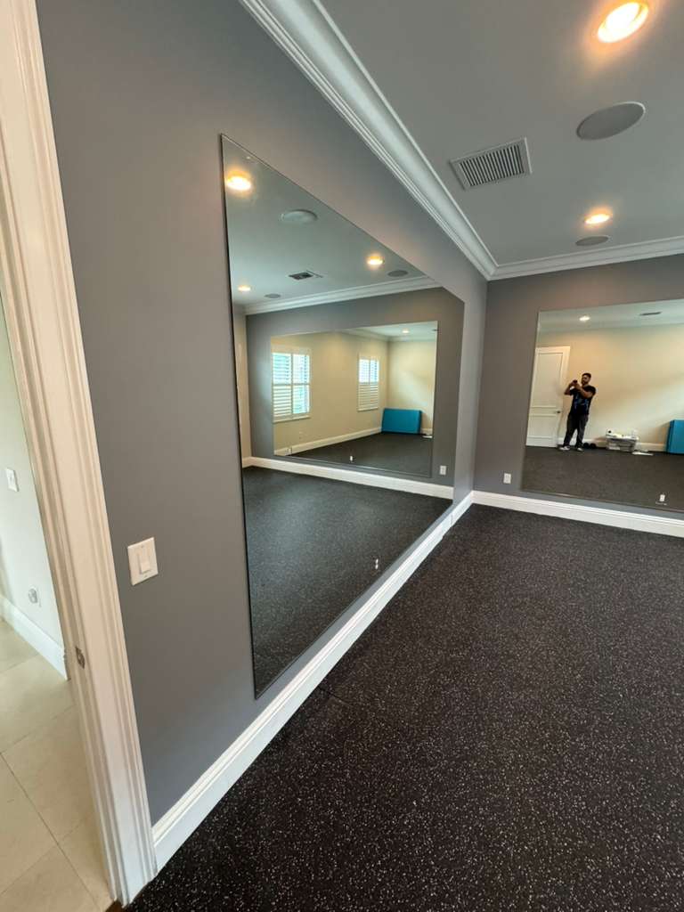 This project in Delray Beach, FL, involved the fabrication and installation of a large, custom mirror wall designed to enhance both the functionality and aesthetic of the interior space. Two mirror panels were installed, each measuring approximately 120" x 84", fabricated from ¼" clear 1st grade UltraMirror glass for superior reflection and durability.