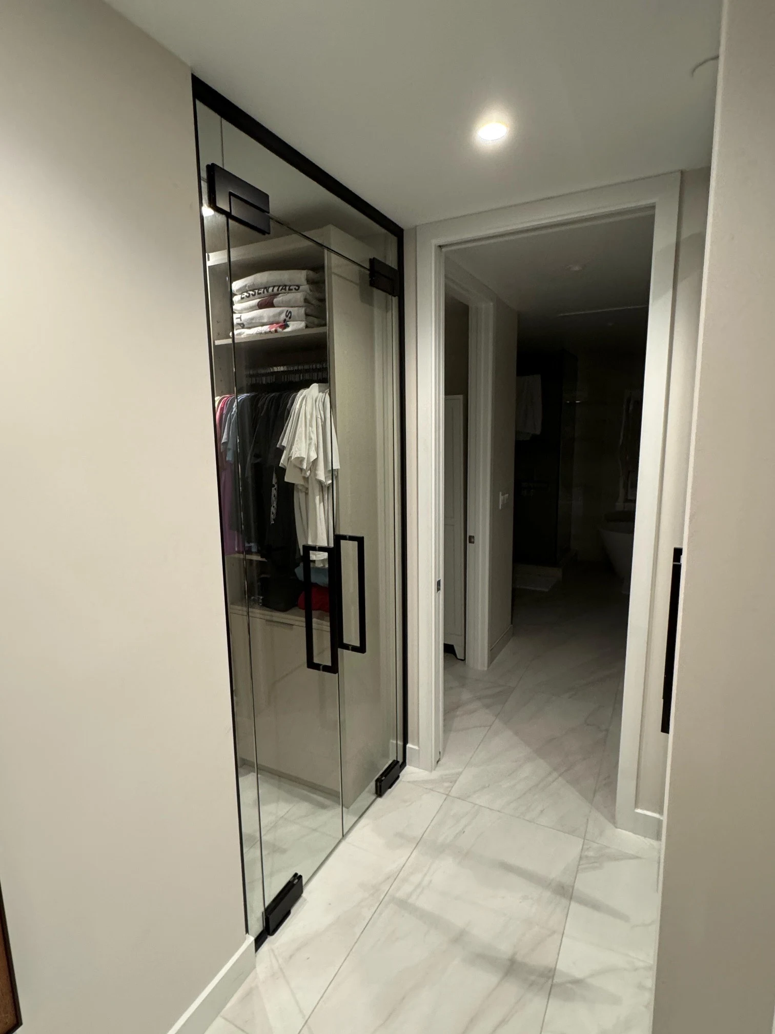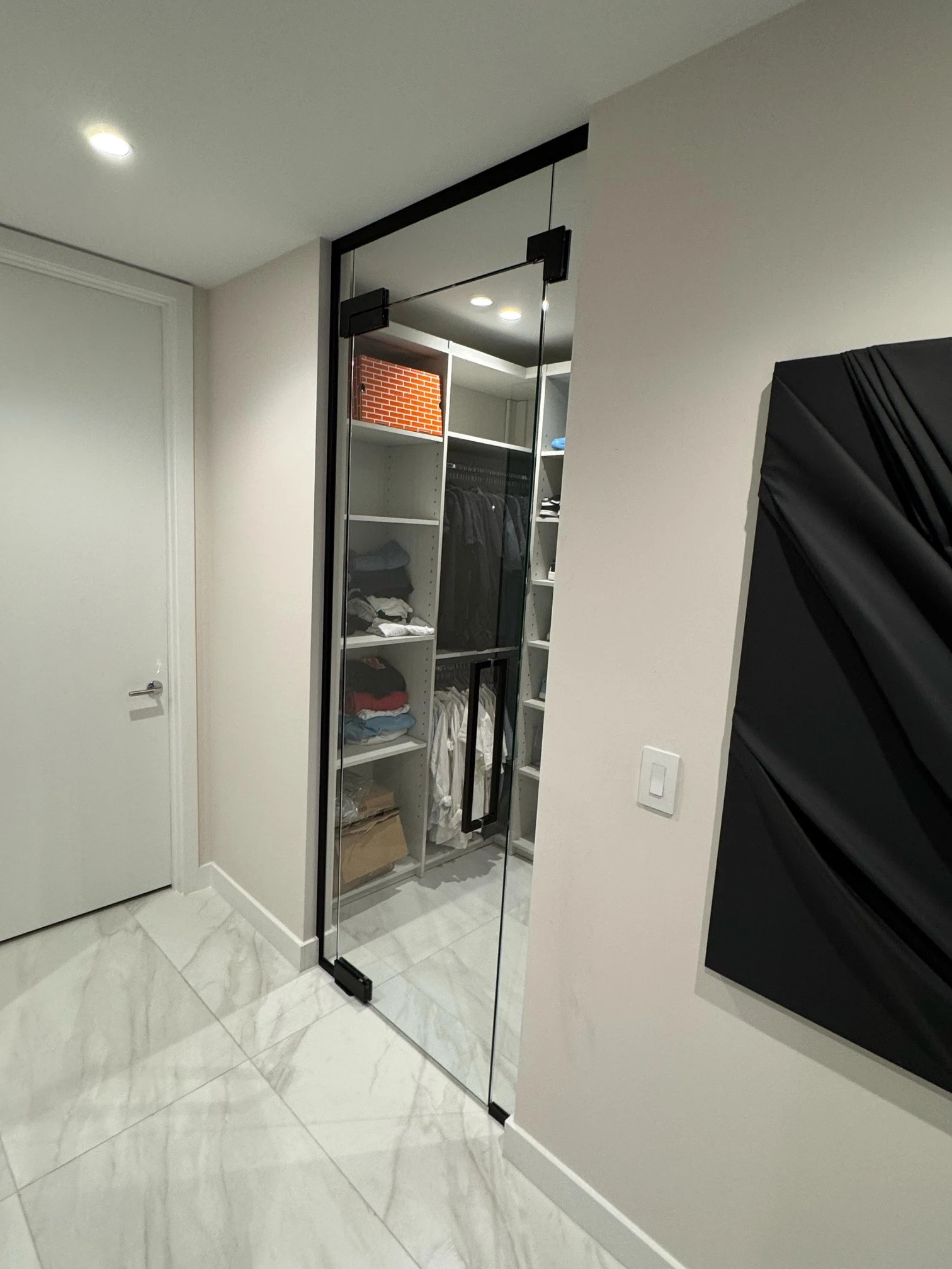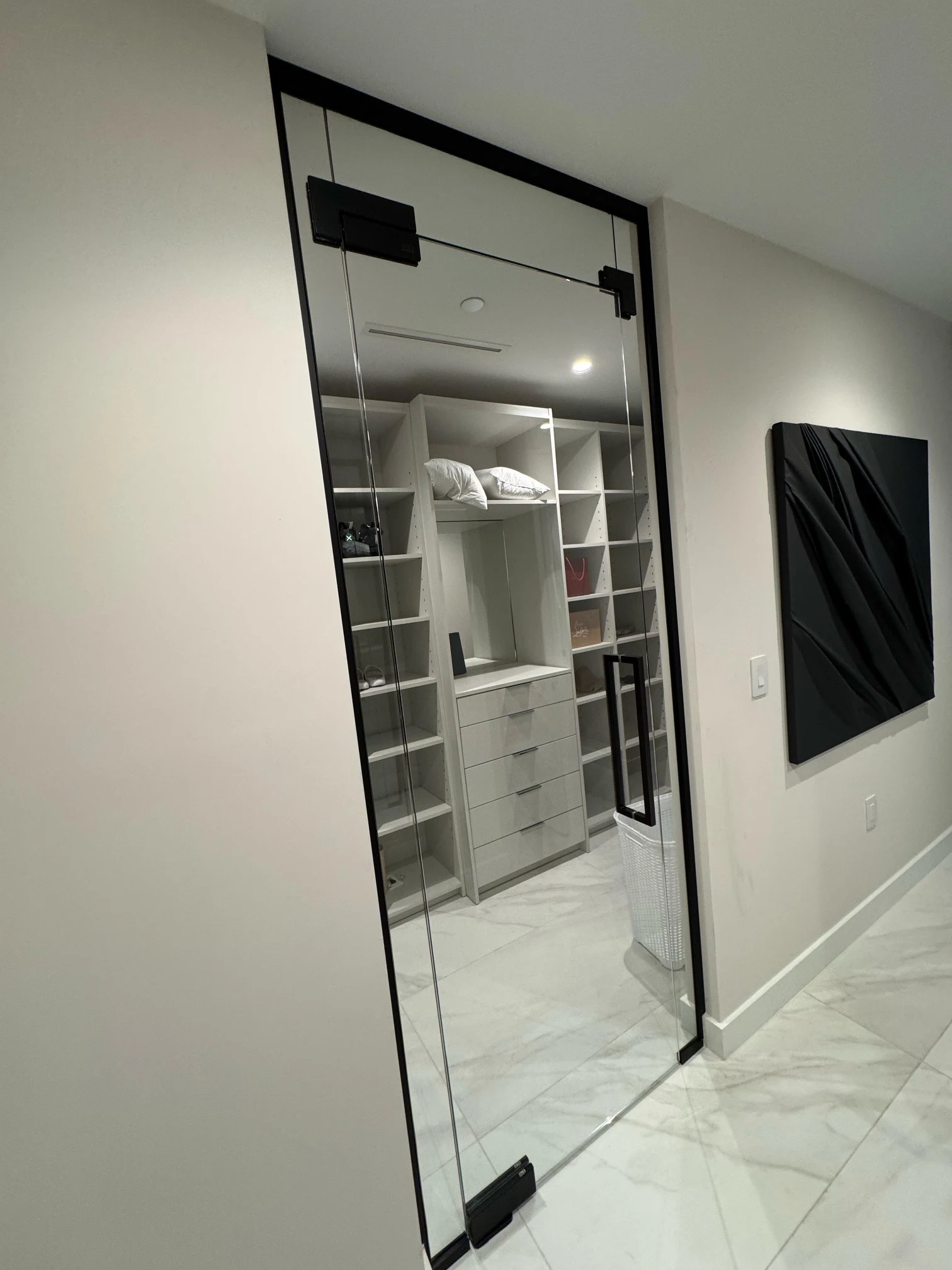 This project transforms multiple interior spaces in a Boca Raton residence using clear and acid‑etched glass partitions, outfitted with sleek hardware and decorative grids. From a shoe closet to bedrooms and a shower panel, each installation balances transparency, privacy, and modern style.