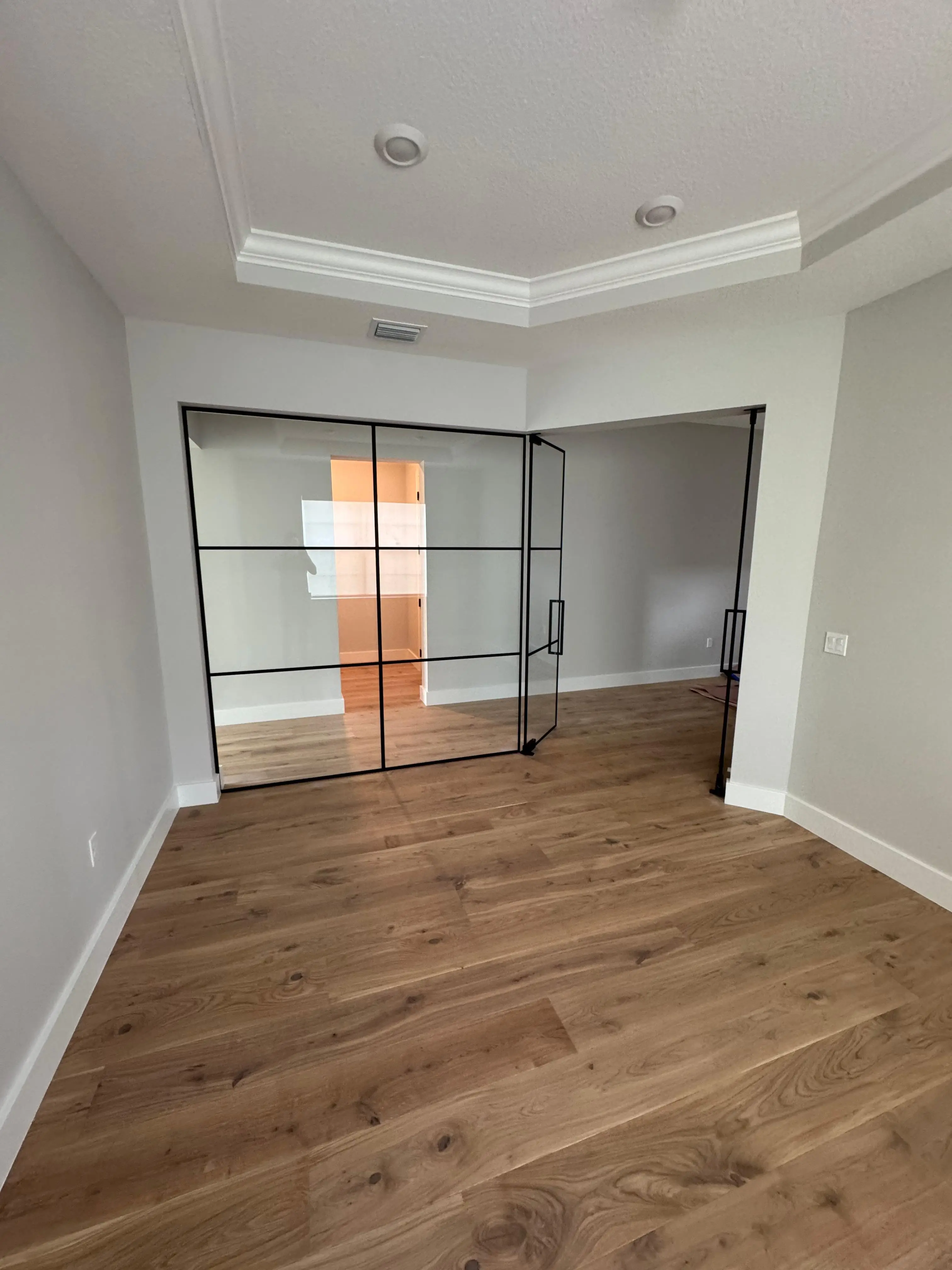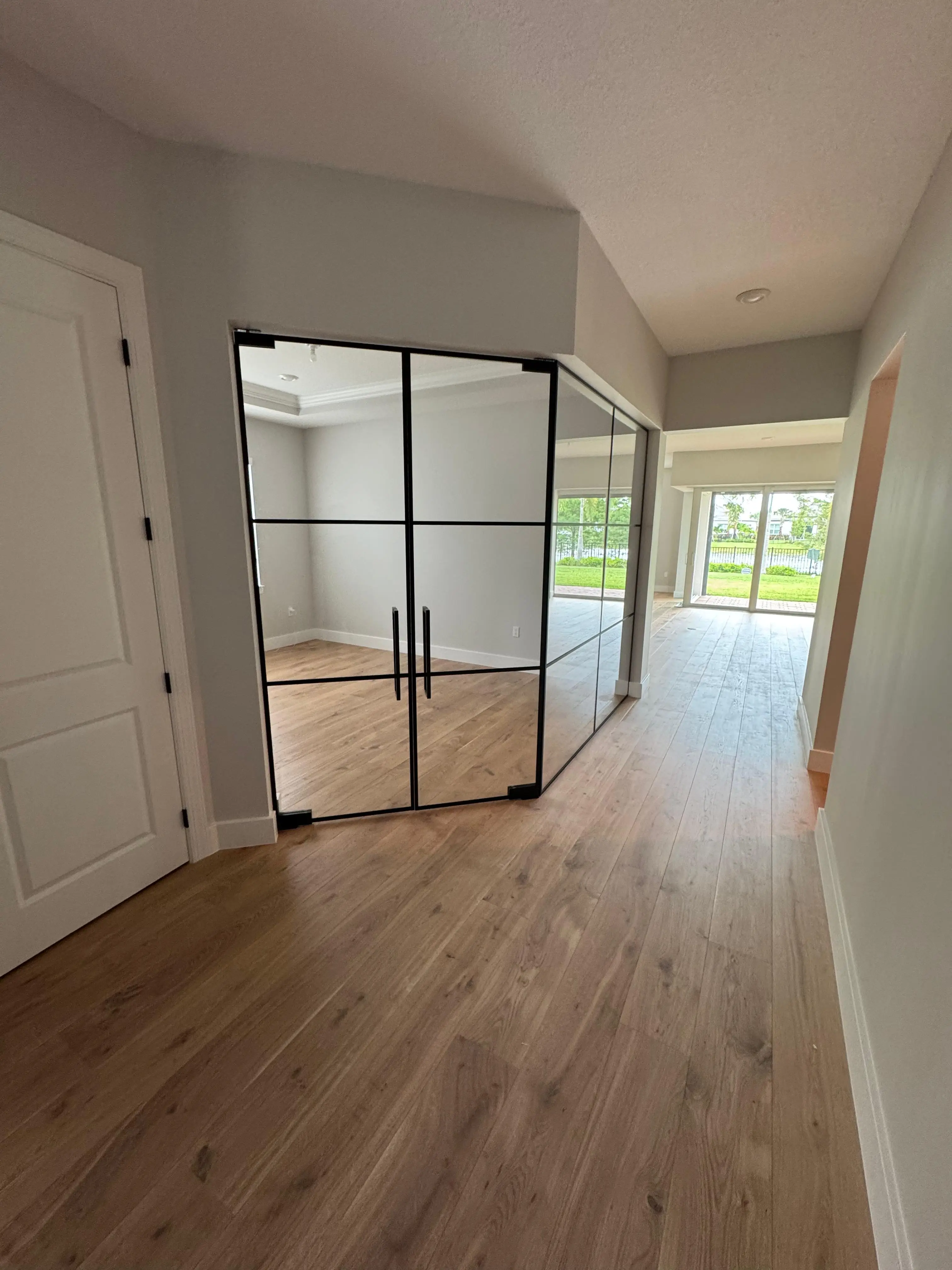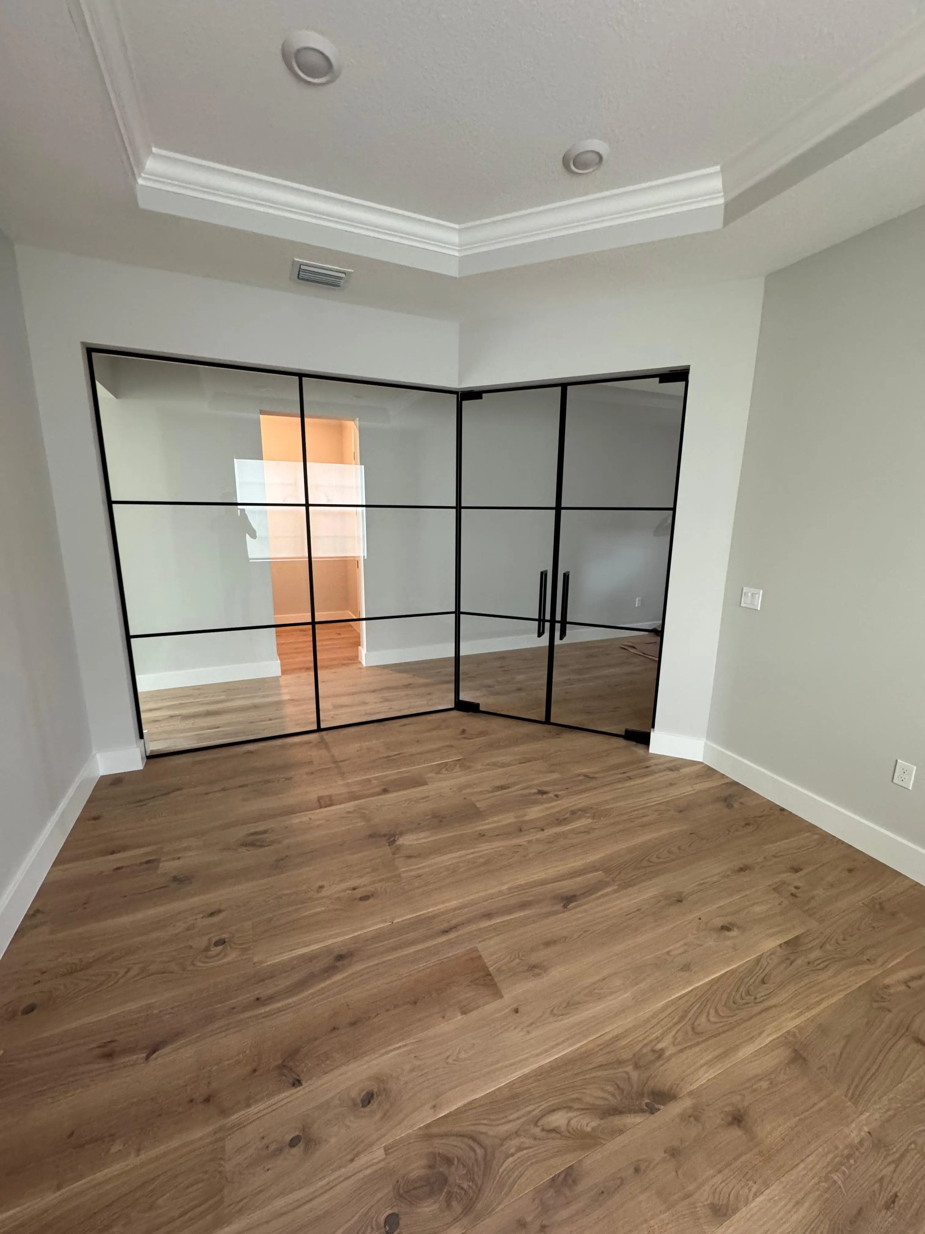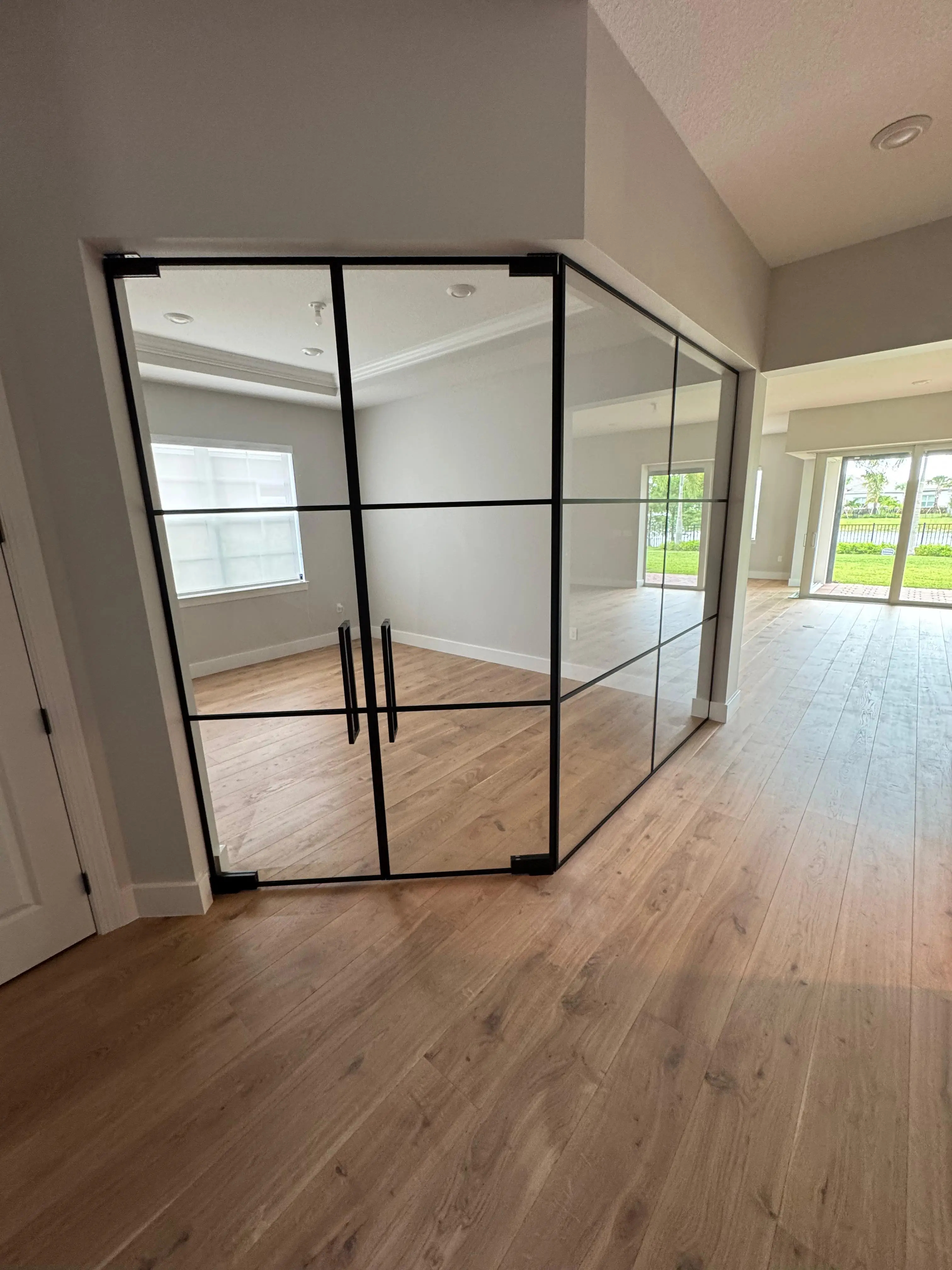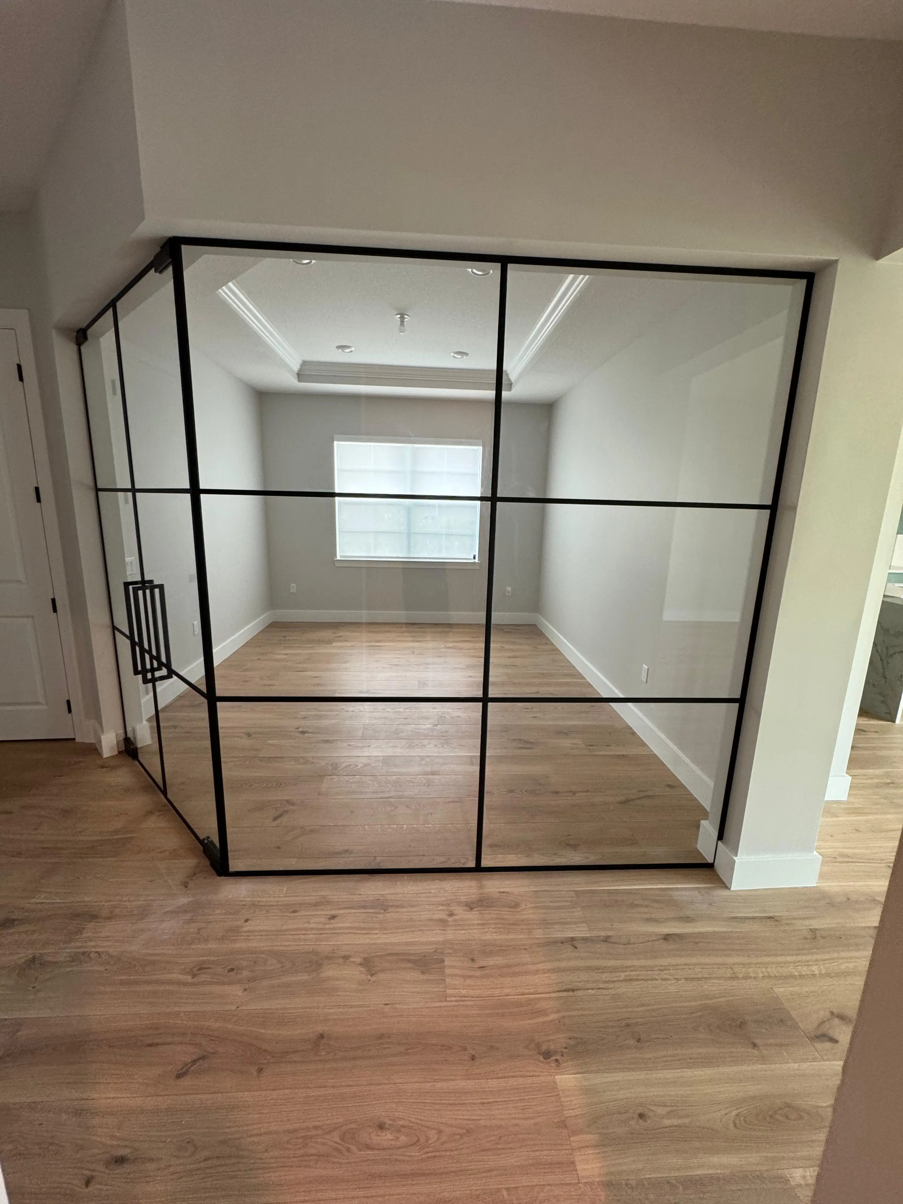 This project in West Palm Beach, FL, involved the fabrication and installation of a sophisticated interior glass partition. Crafted from ½” low-iron monolithic tempered glass and complemented by a matte black hardware finish, the design incorporates aluminum grids applied with silicone for a refined architectural detail. The partition was installed with commercial-grade hydraulic self-soft closure hinges with 90° hold-open functionality, along with architectural top and bottom U-channels to ensure durability and seamless integration. To support the client’s vision, 3D renders were offered as a standalone service for a $500 non-refundable deposit, later credited toward the project balance upon proceeding with fabrication and installation.