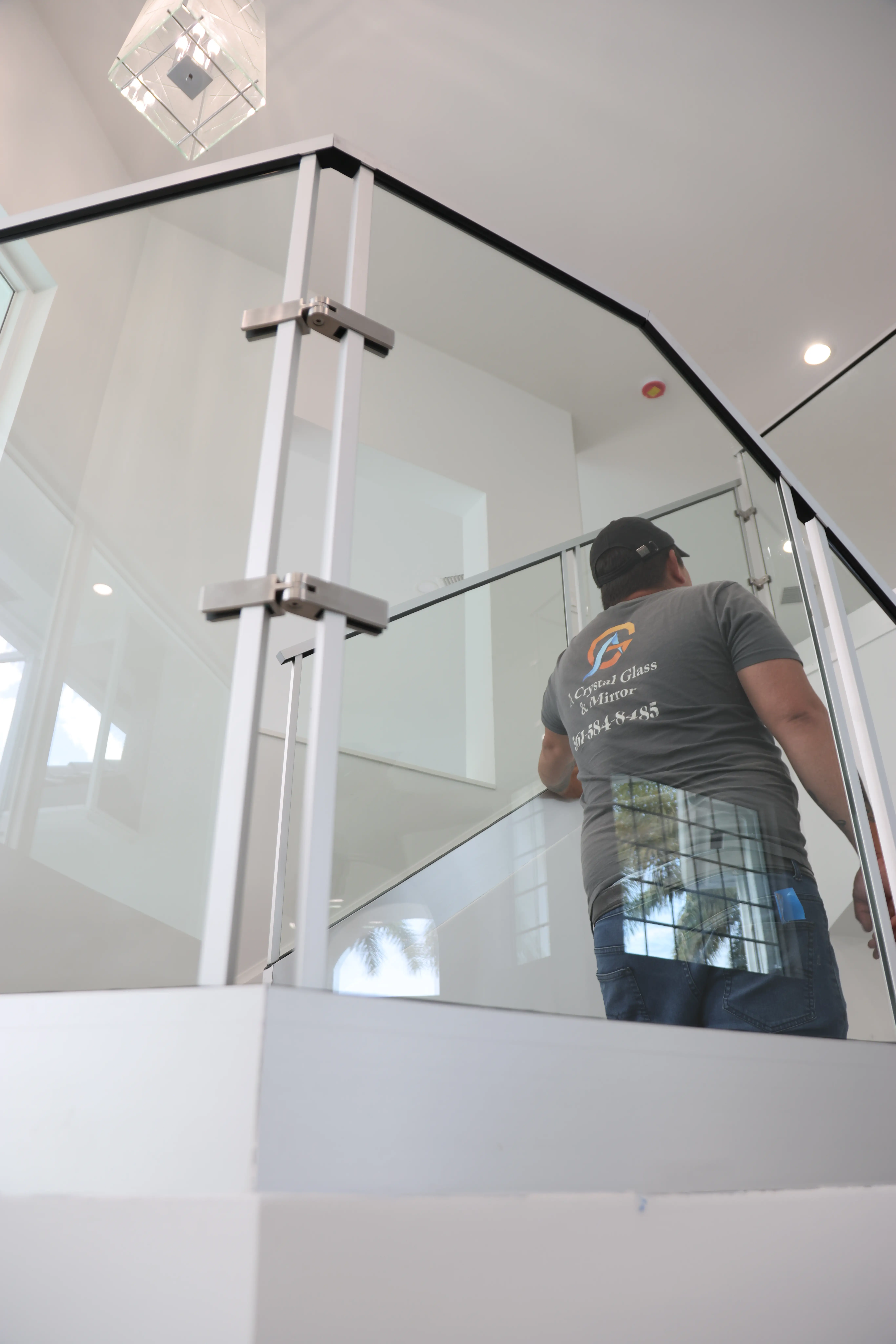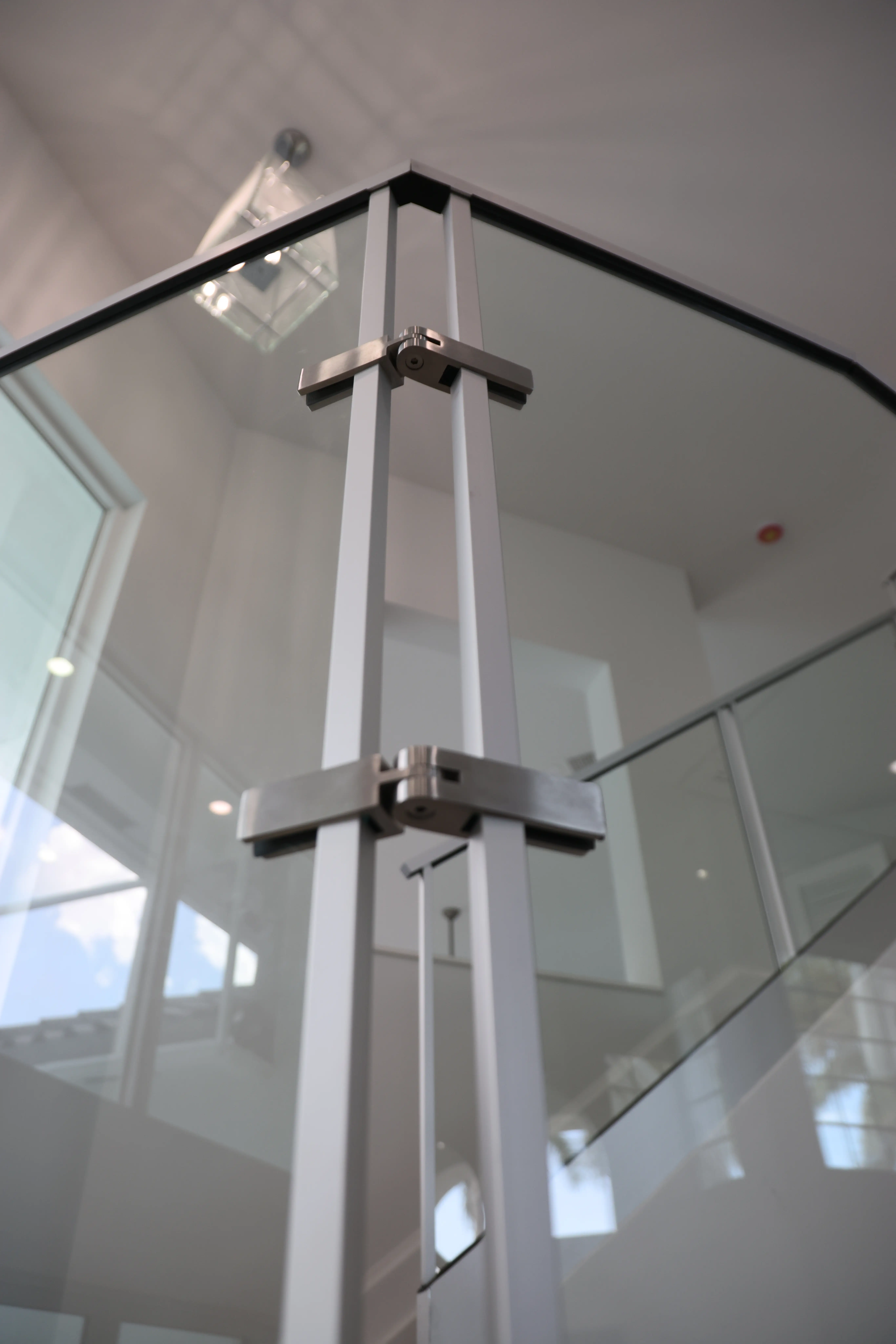 All glass edges were machine high-polished for a flawless appearance. The railings were carefully designed with varying heights—38” for the stair section and 42” for balconies and landings—ensuring functionality and compliance with safety standards. With a total span of 58 linear feet, the installation creates a sophisticated and open aesthetic.