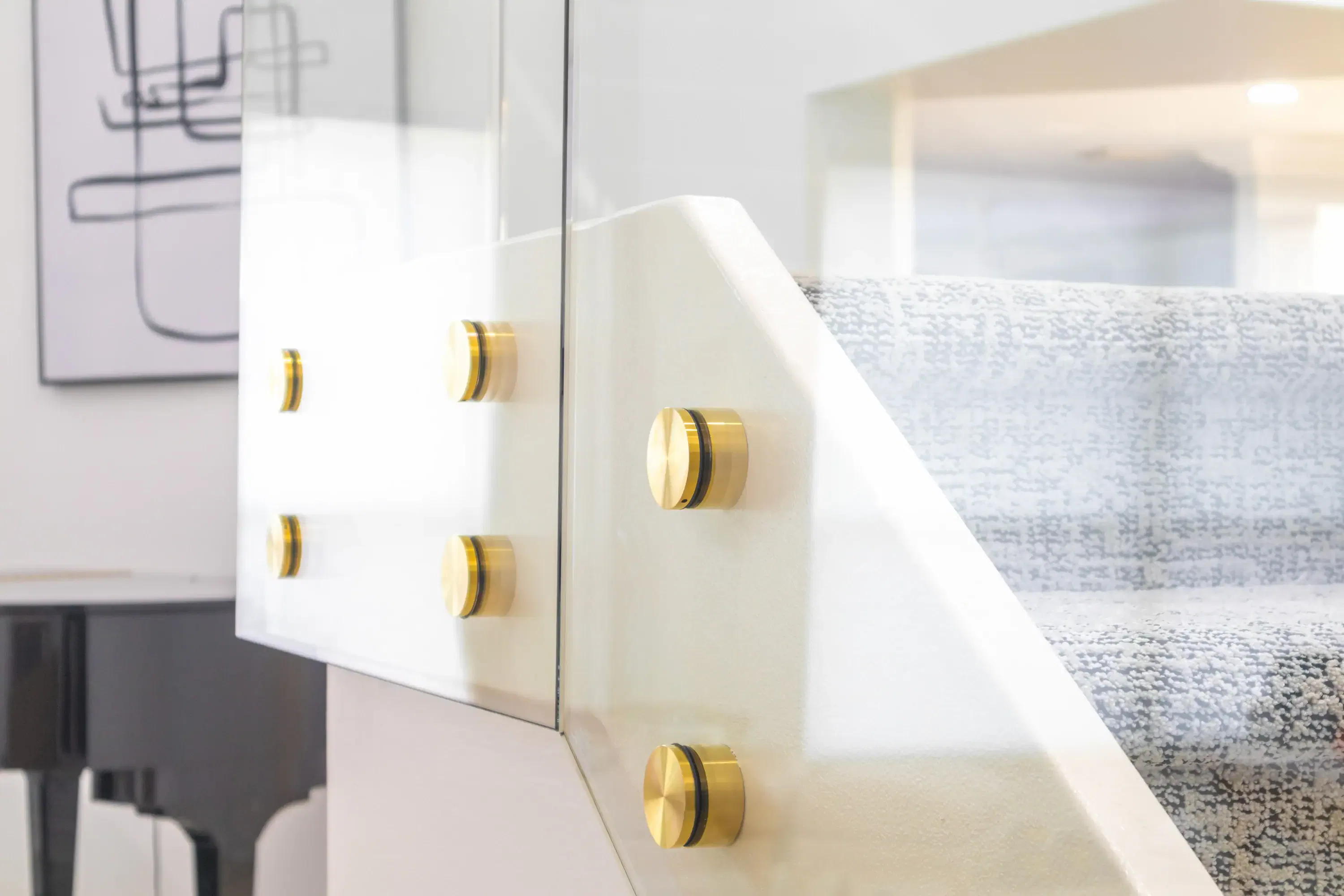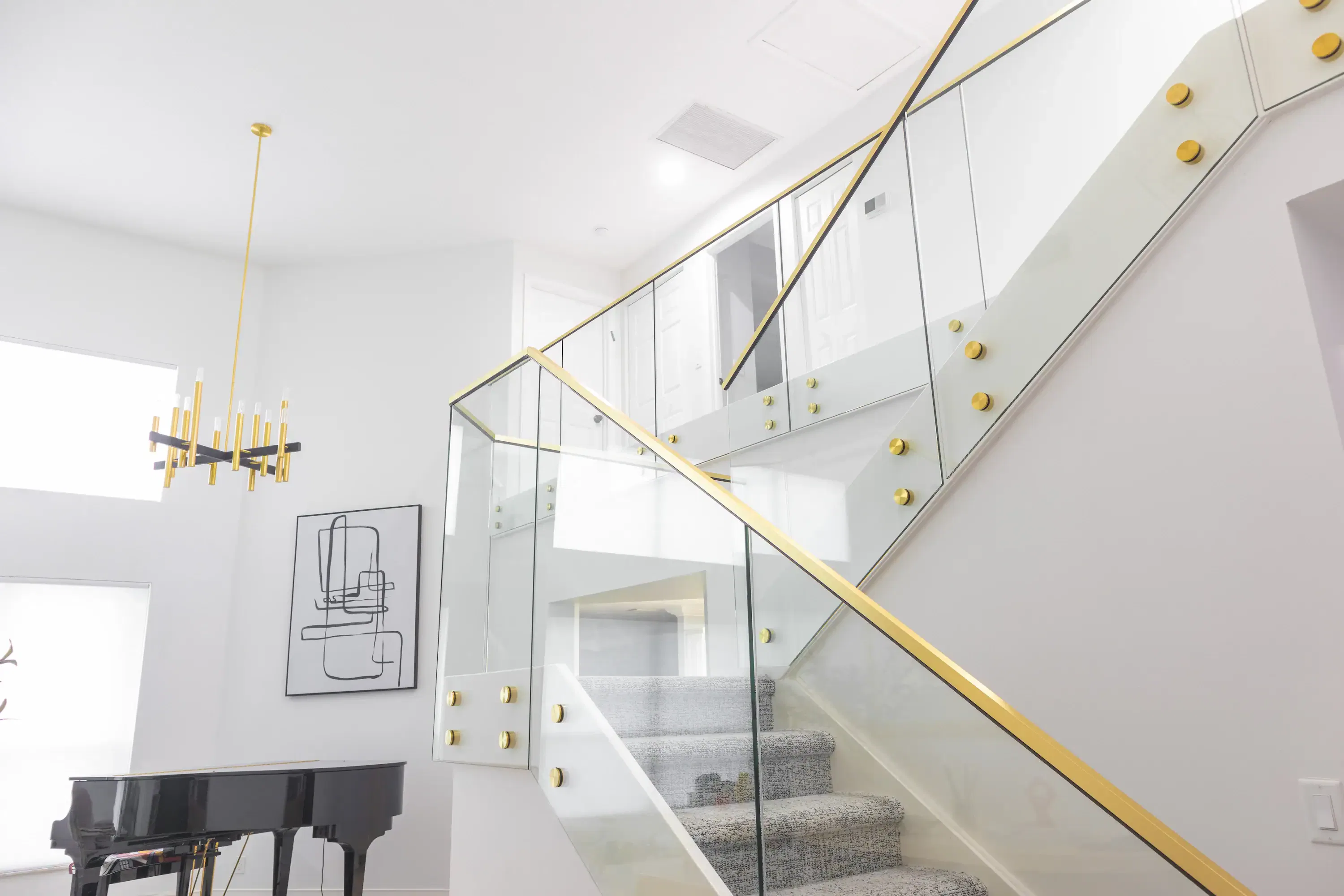 Showcasing a contemporary interior featuring a glass staircase with gold details and safety features.