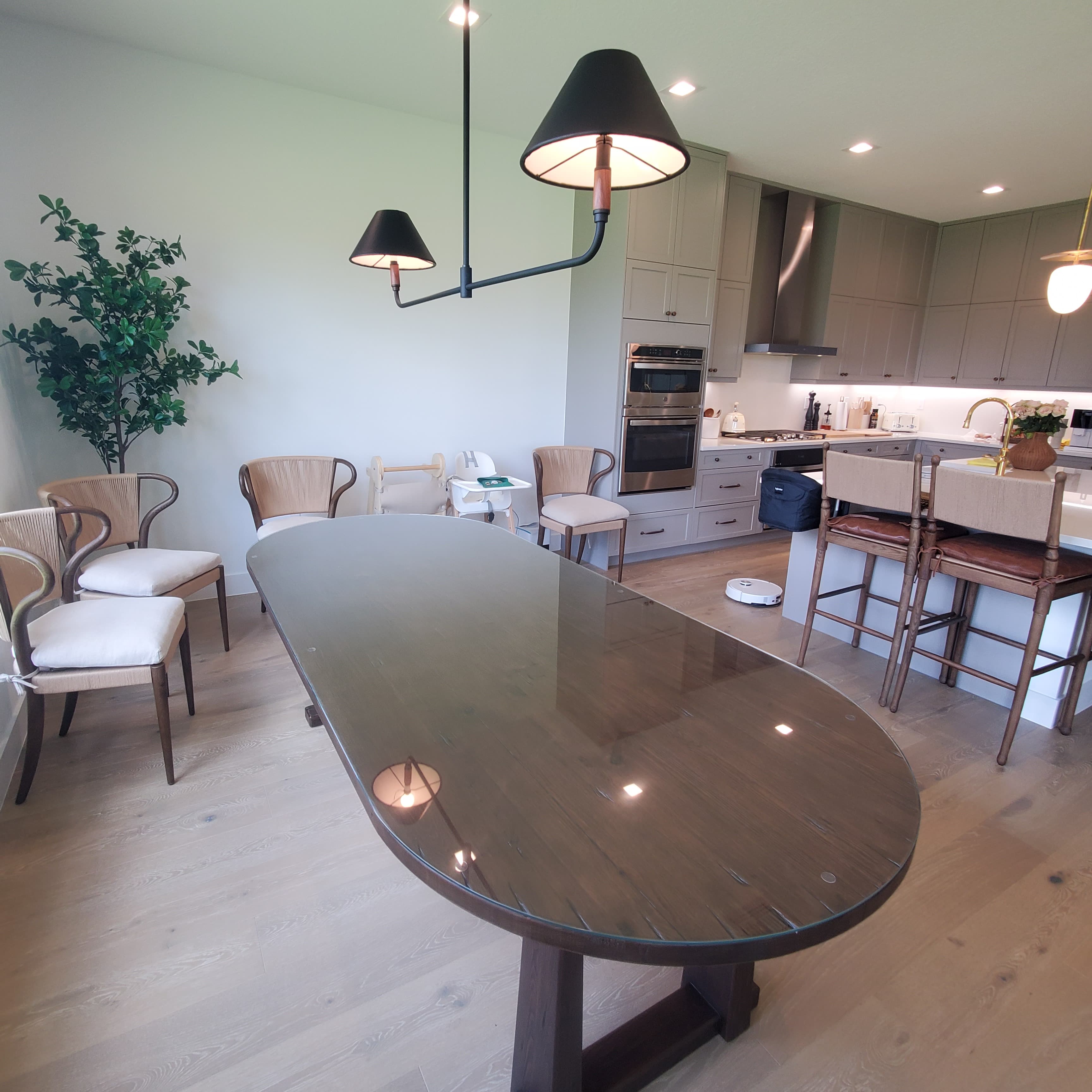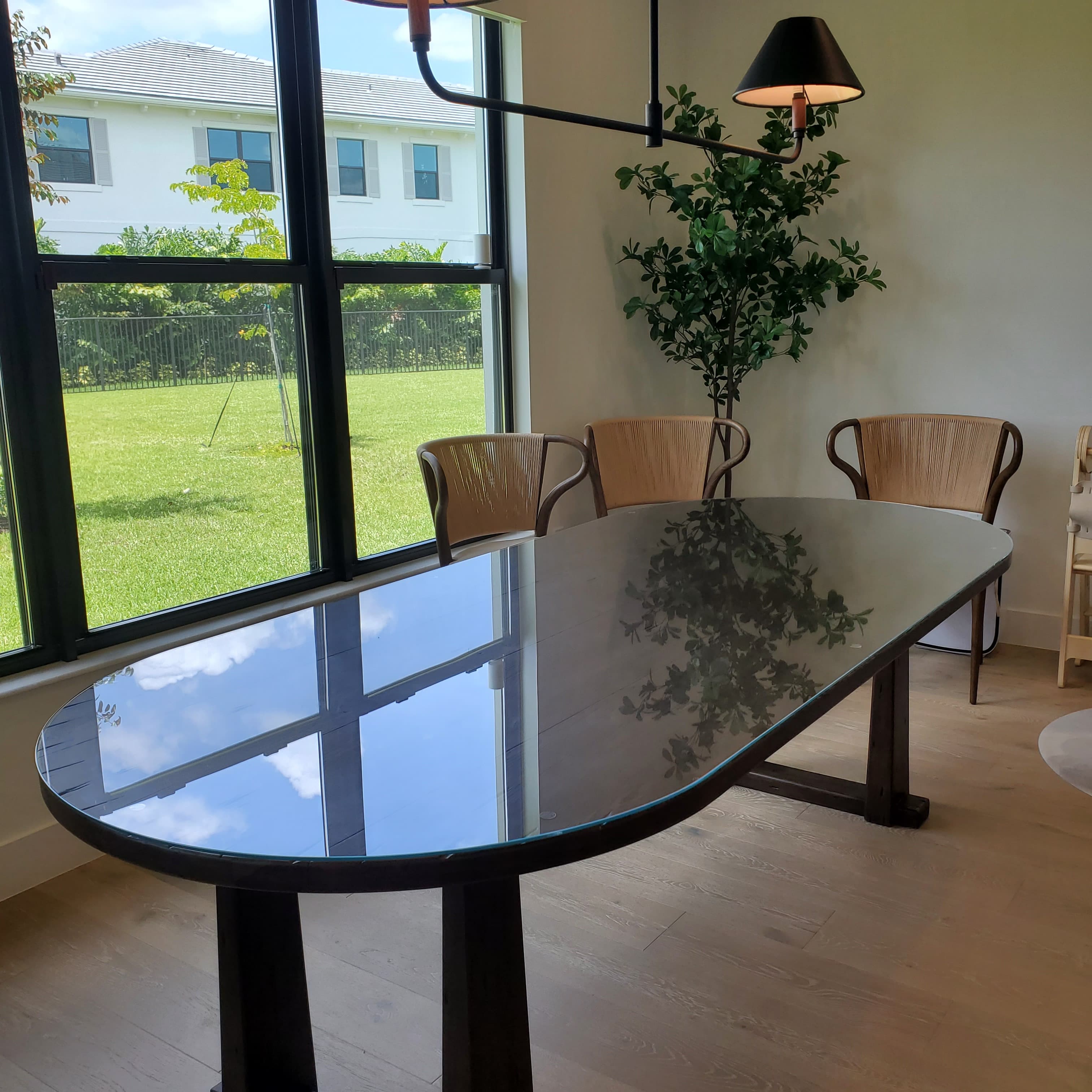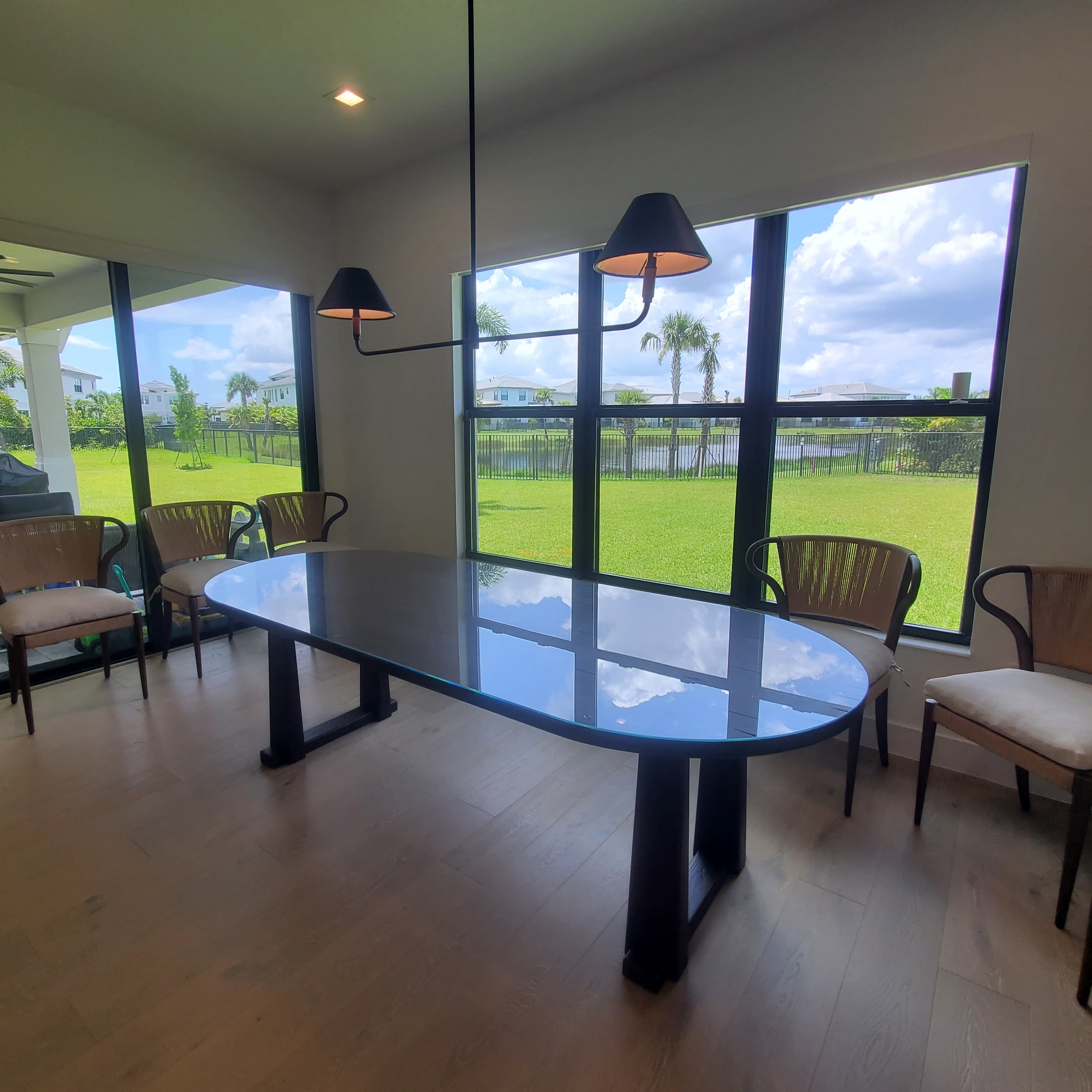 we fabricated and installed a custom glass tabletop designed for both elegance and durability. The tabletop was crafted from 1/4" low-iron tempered glass with machine-polished edges to ensure a sleek, clean finish. A precise template was created to match the exact dimensions of the space: 98 3/8" x 41 15/16".