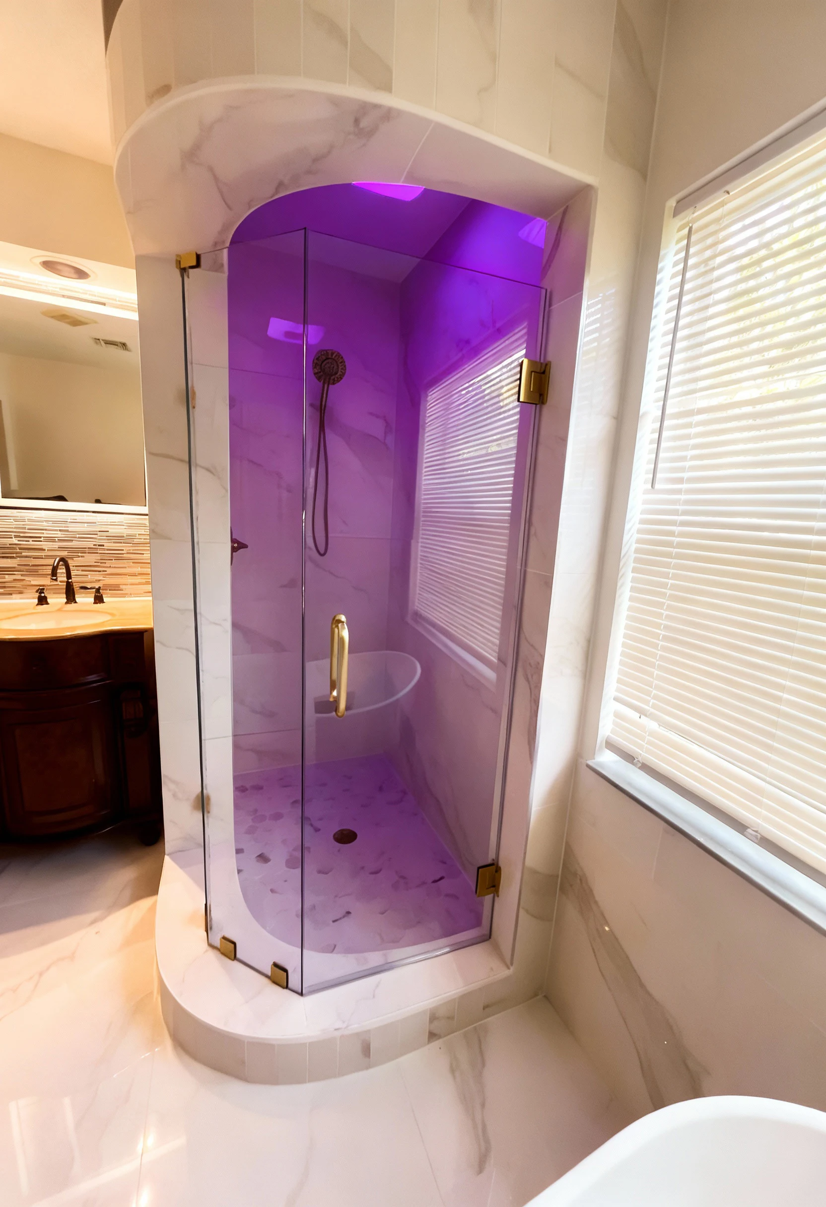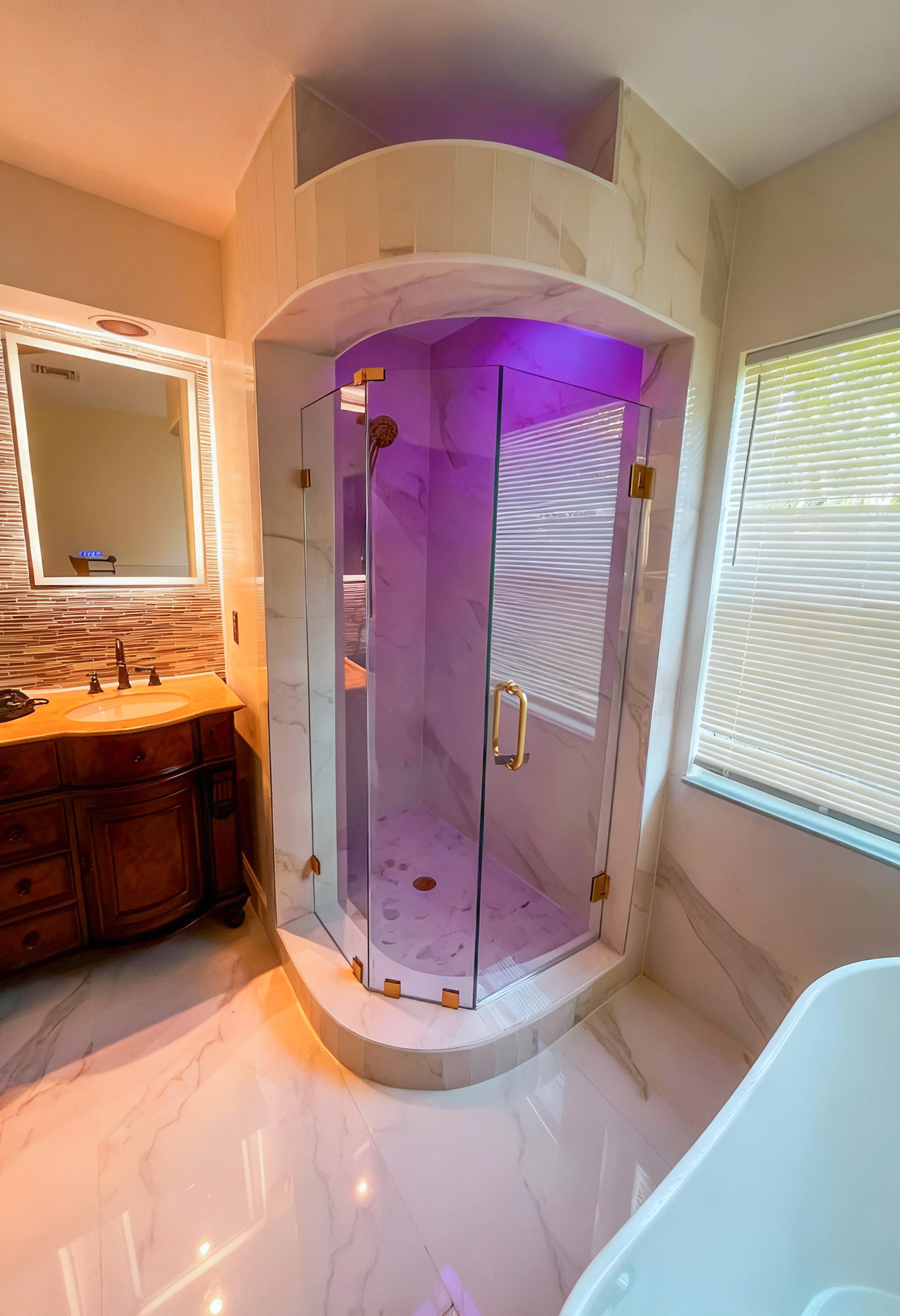 This residential project in West Palm Beach, FL, featured the fabrication and installation of a frameless shower enclosure with a satin brass hardware finish. The enclosure was built with 3/8” clear monolithic tempered glass, combining strength, safety, and style for a refined bathroom upgrade.