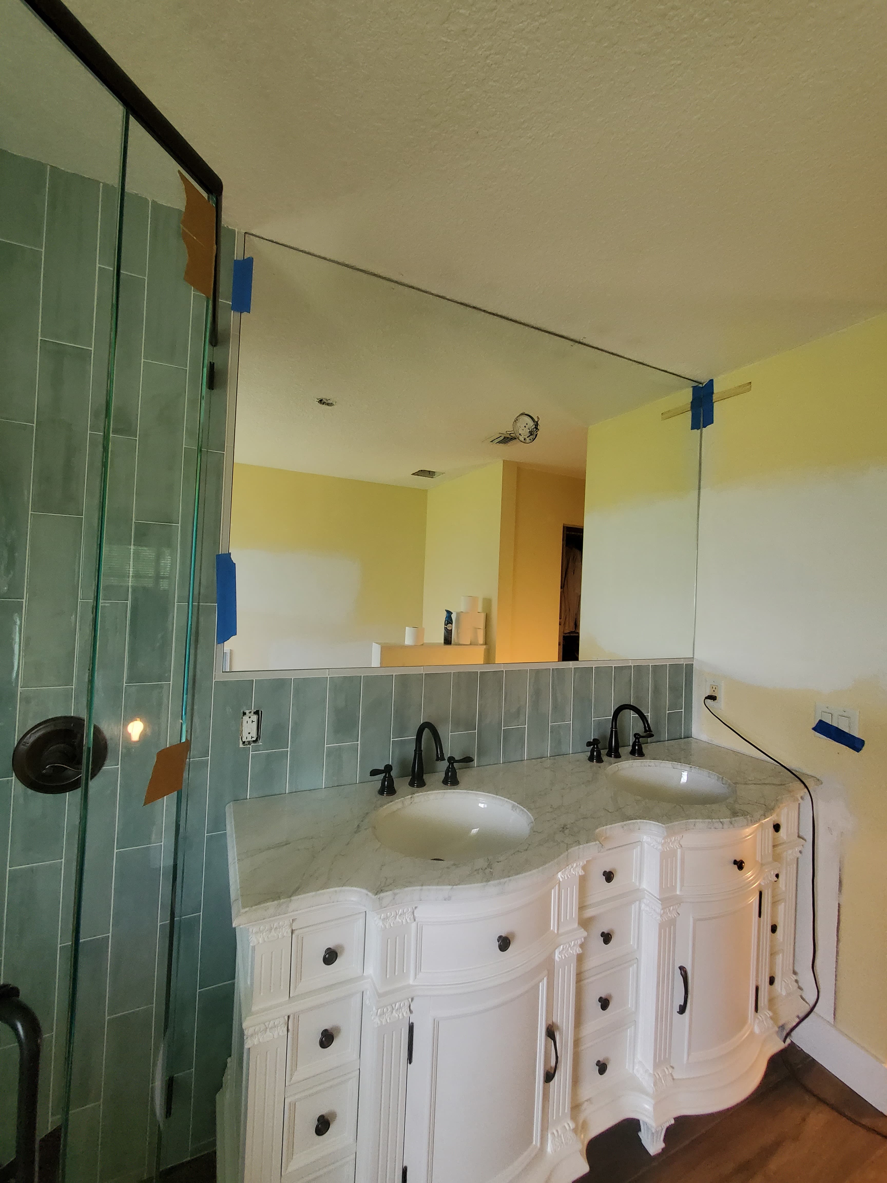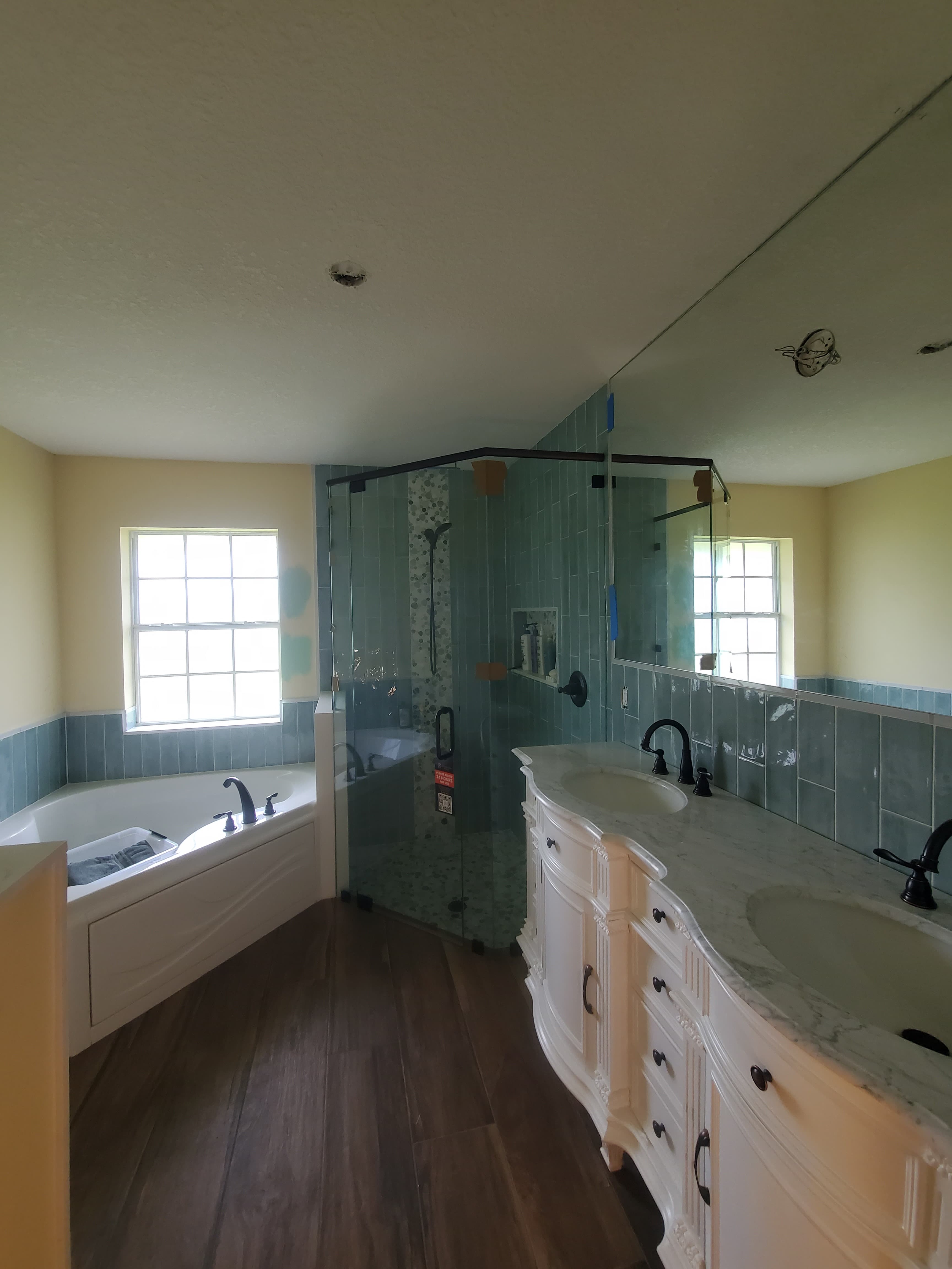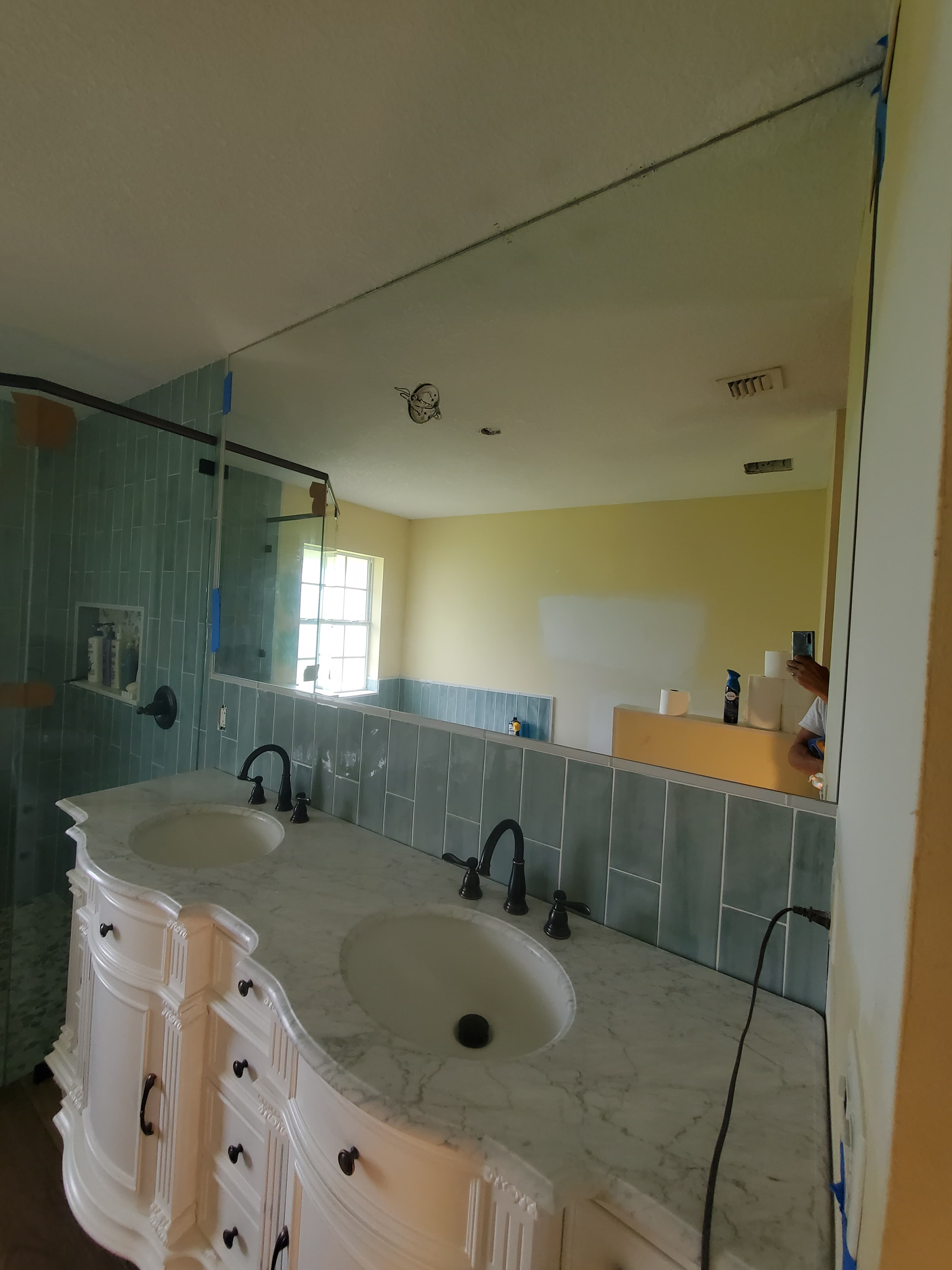 This project in West Palm Beach, FL, included the installation of a frameless shower enclosure and a custom mirror. The shower enclosure was crafted with 3/8” clear tempered glass and finished with oil-rubbed bronze hardware, offering both elegance and durability. The mirror, made from ¼” clear 1st grade glass, was designed to perfectly complement the bathroom space. Both elements were carefully fabricated and installed, ensuring a seamless, high-quality finish.