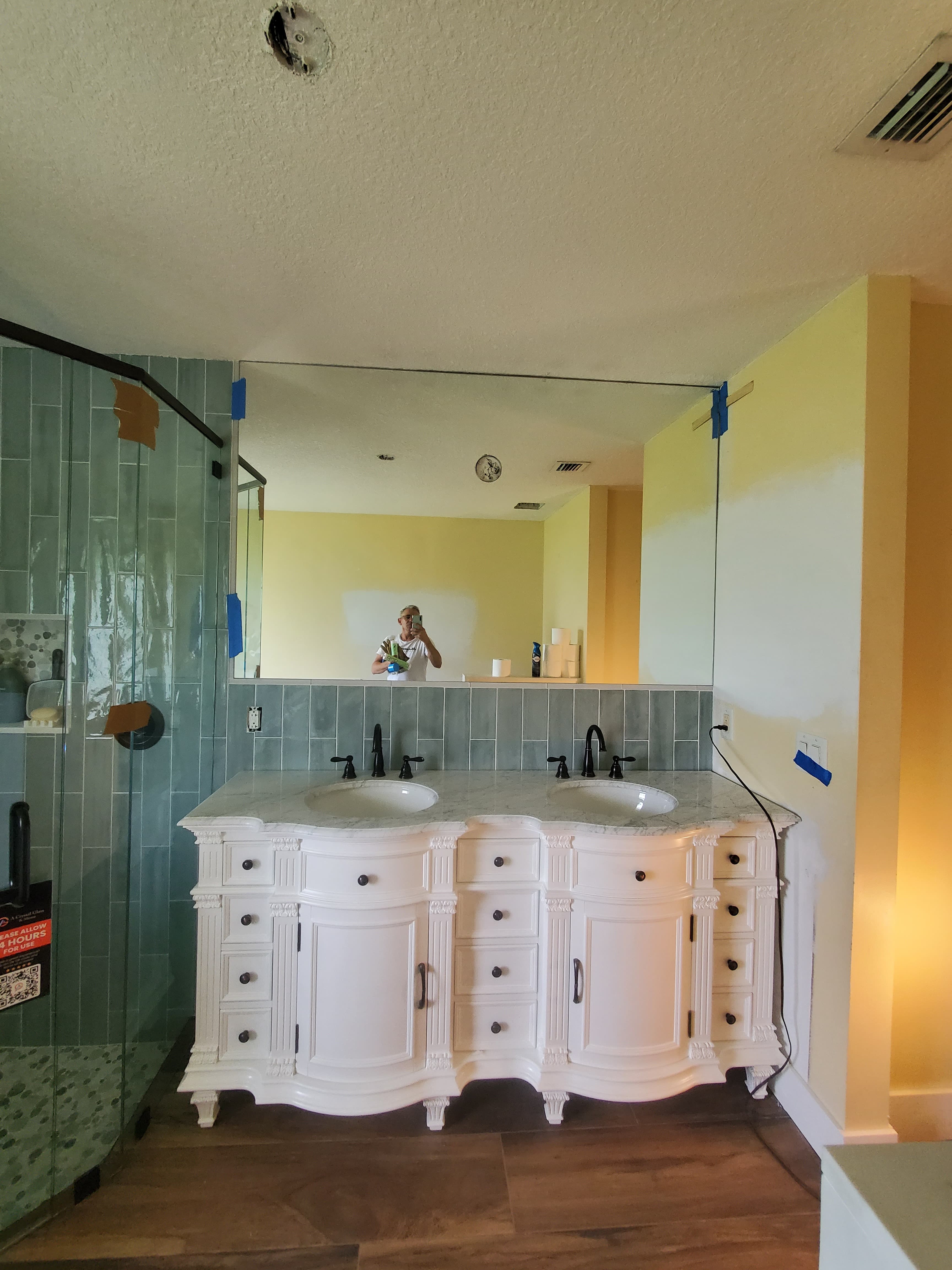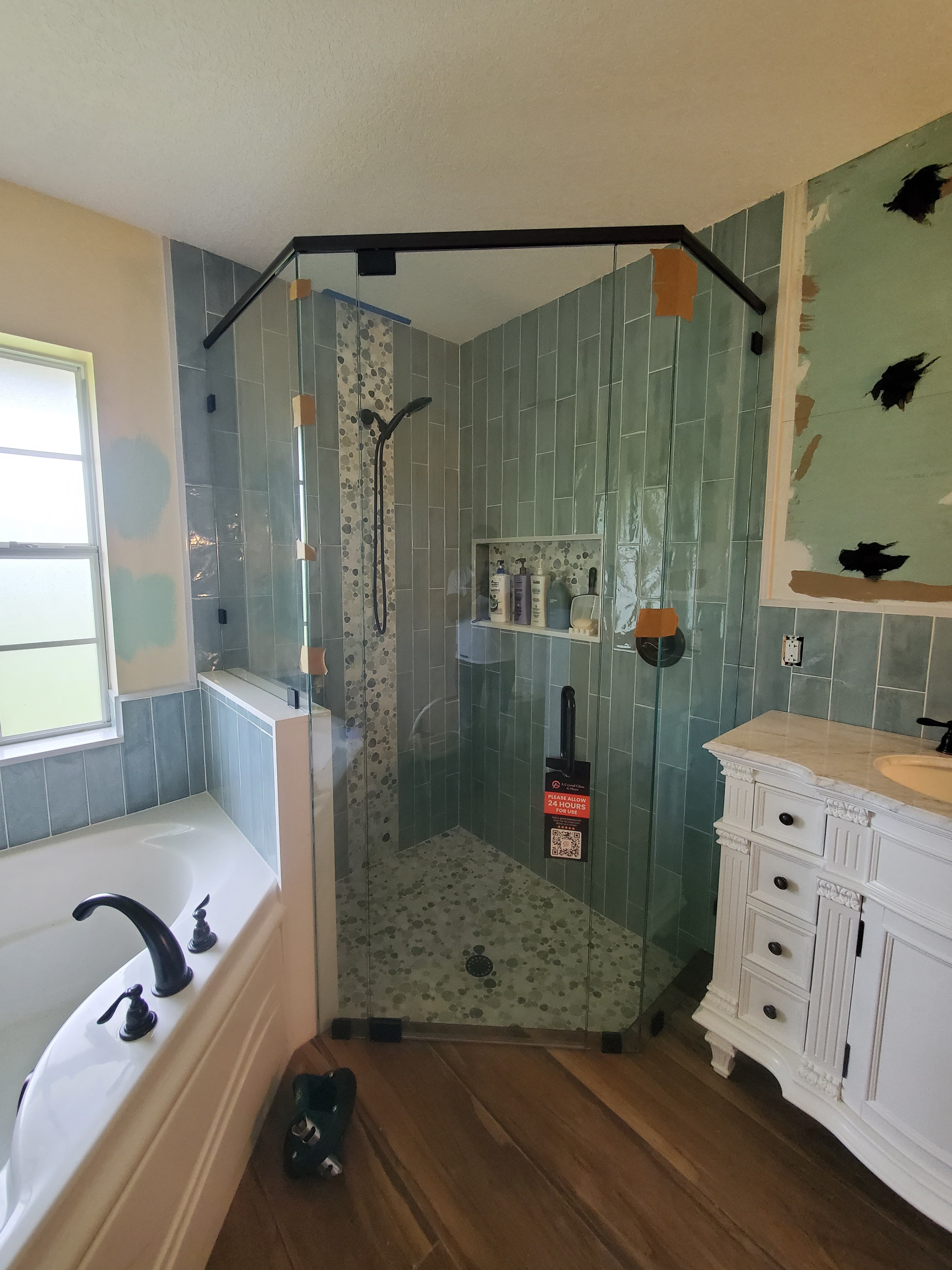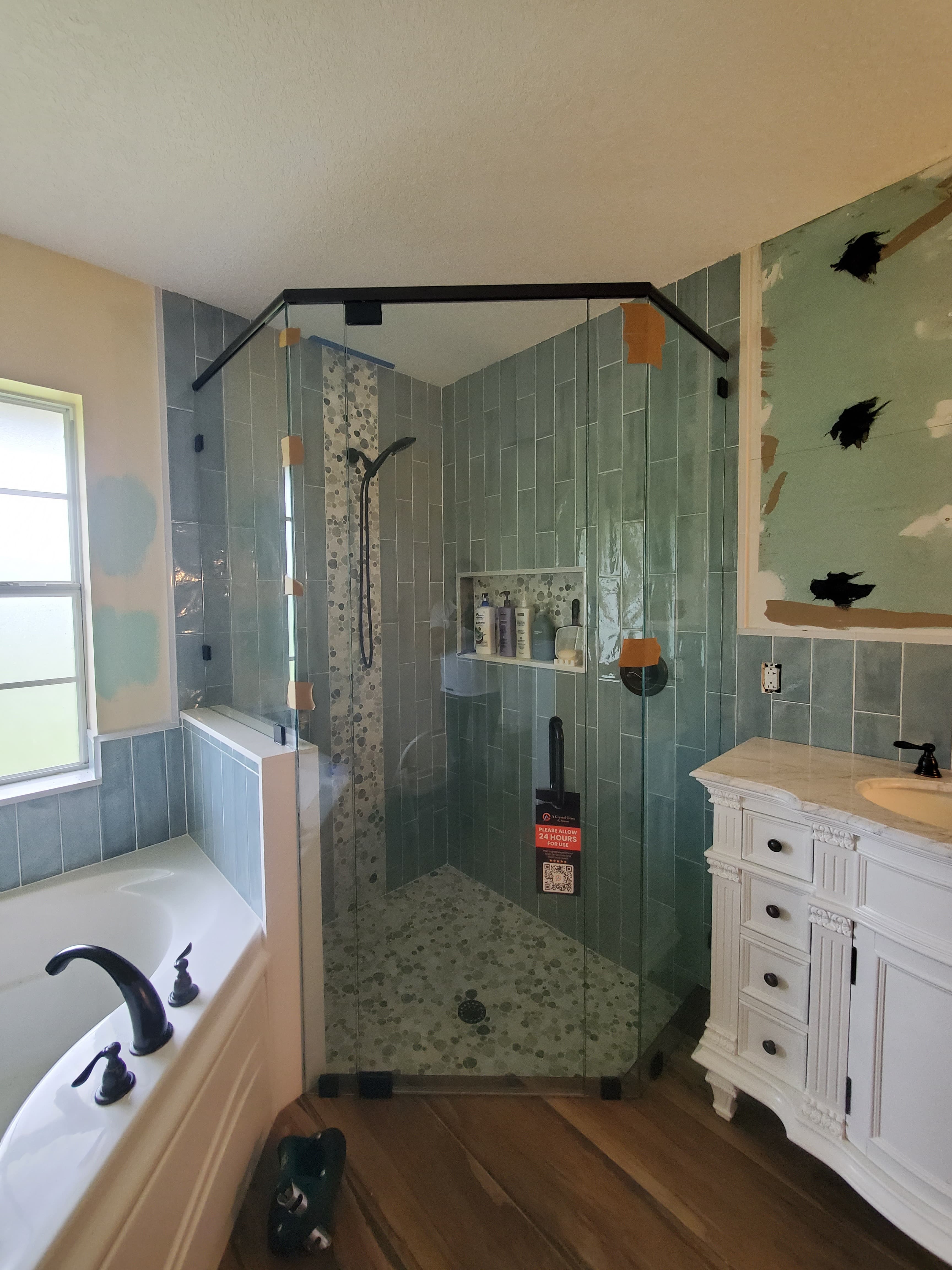 This project in West Palm Beach, FL, included the installation of a frameless shower enclosure and a custom mirror. The shower enclosure was crafted with 3/8” clear tempered glass and finished with oil-rubbed bronze hardware, offering both elegance and durability. The mirror, made from ¼” clear 1st grade glass, was designed to perfectly complement the bathroom space. Both elements were carefully fabricated and installed, ensuring a seamless, high-quality finish.