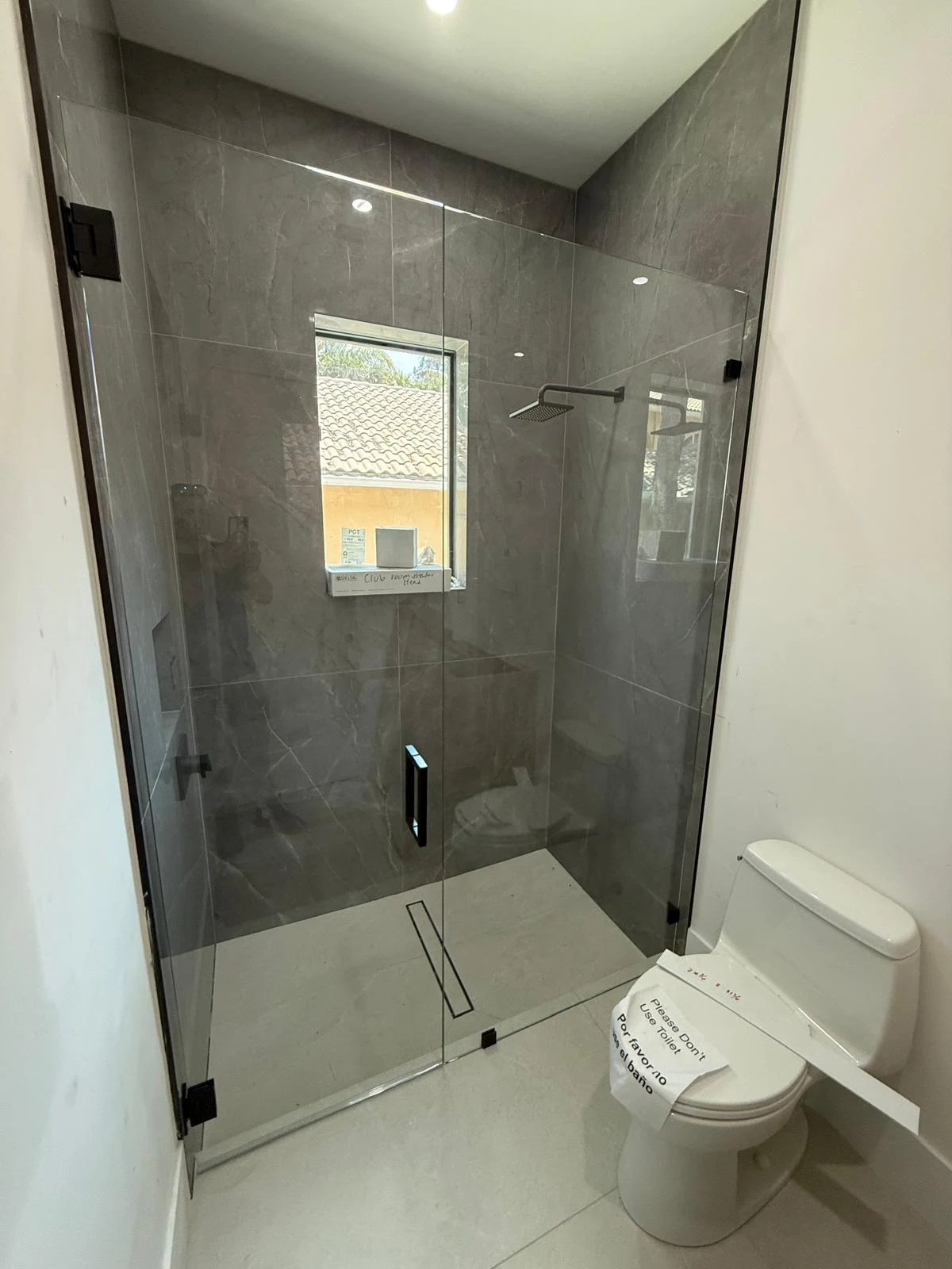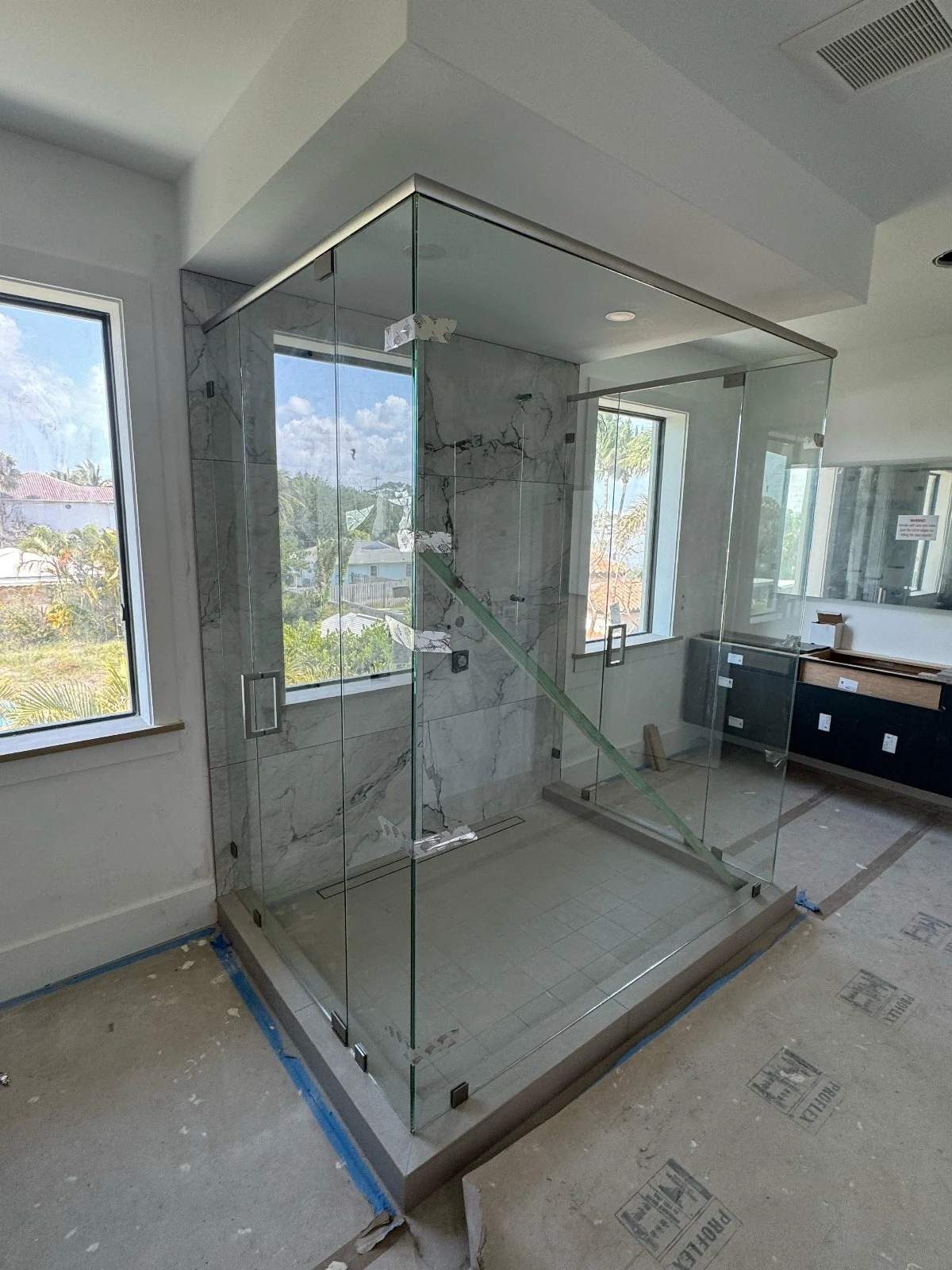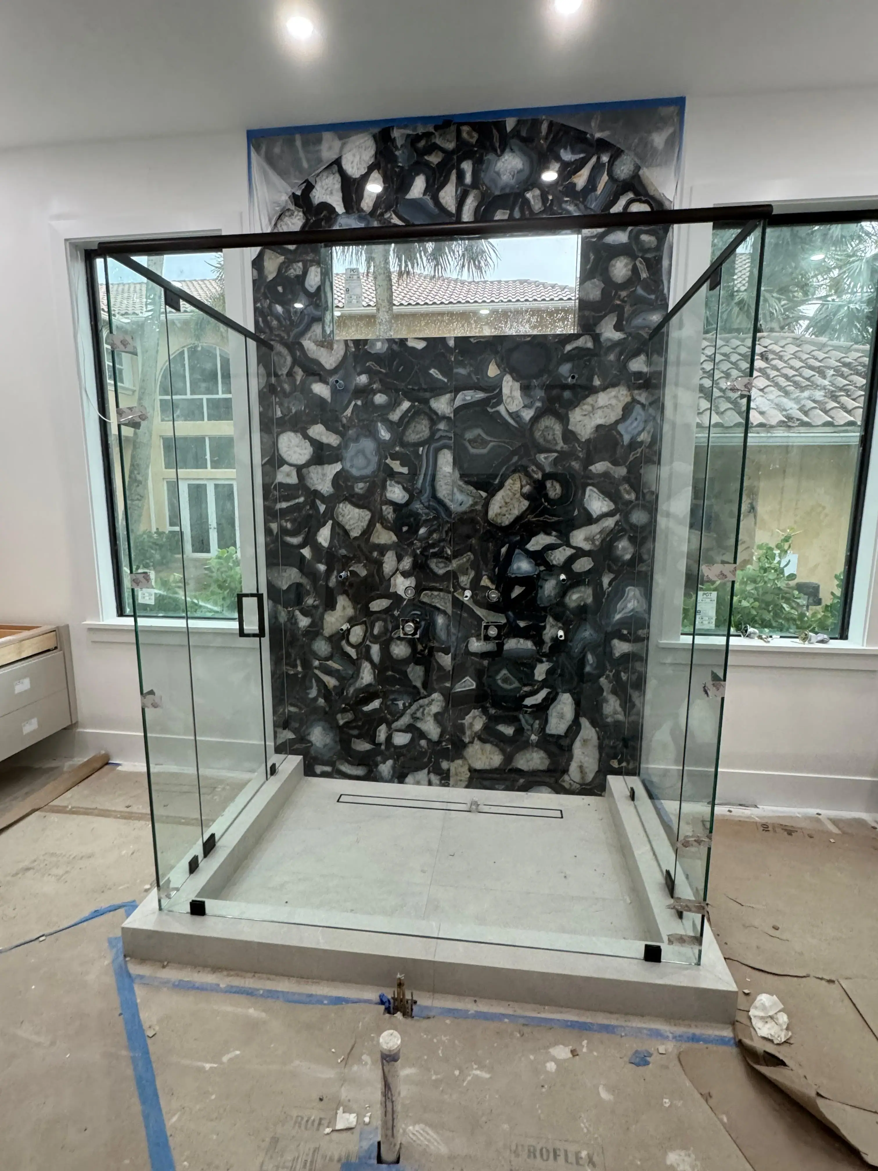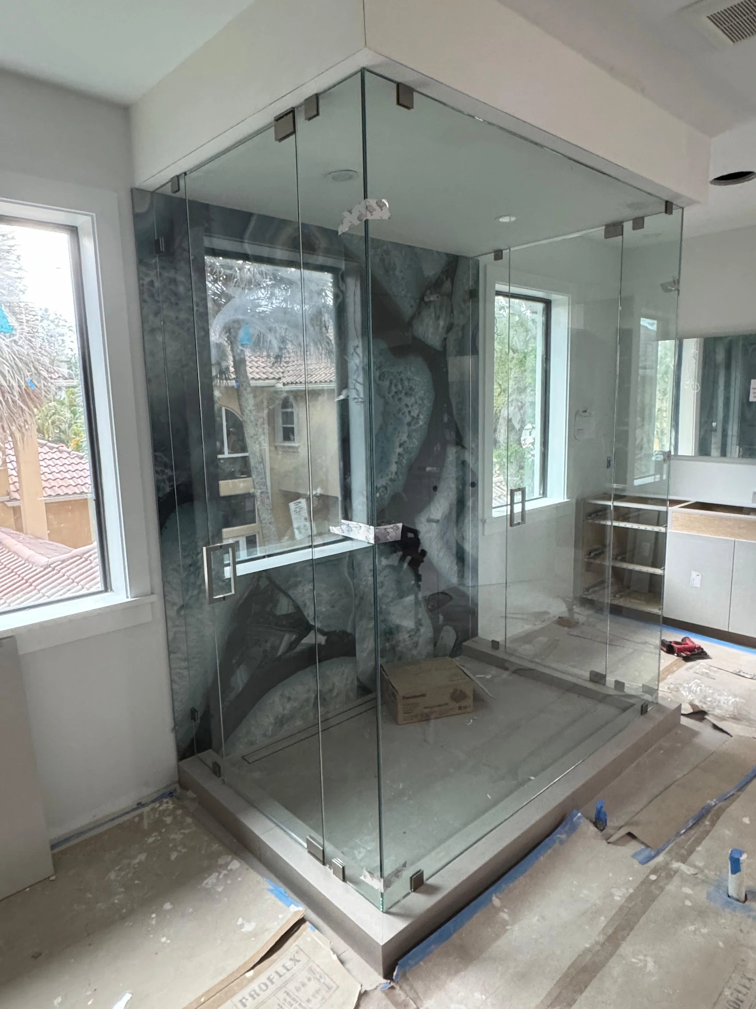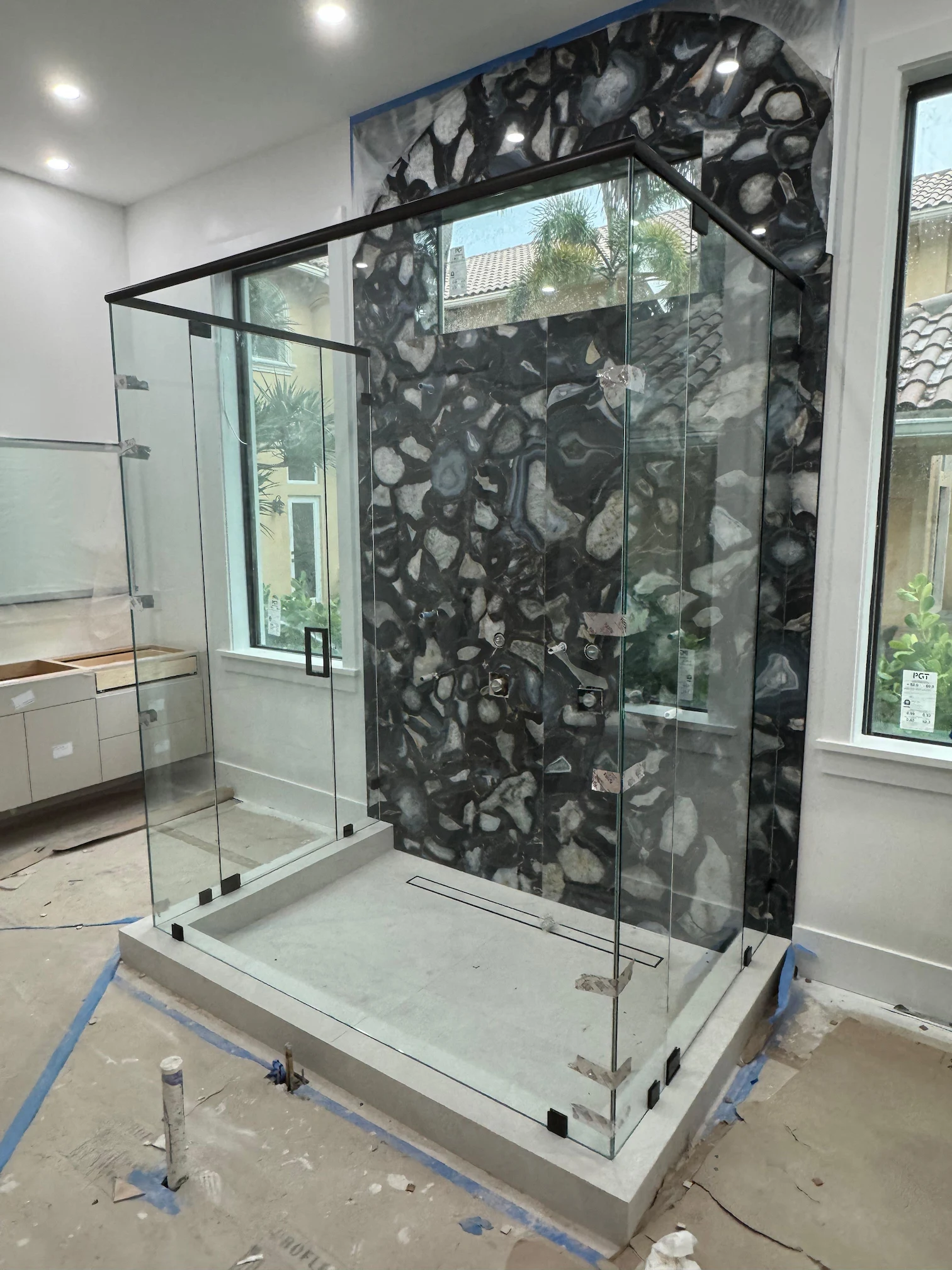 We are currently working on a full custom glass installation for a luxury residence in West Palm Beach, FL. This ongoing project includes interior glass railings, several frameless shower enclosures, and a custom glass wine cellar door. Every element is designed to match the client's style with precision and elegance.
