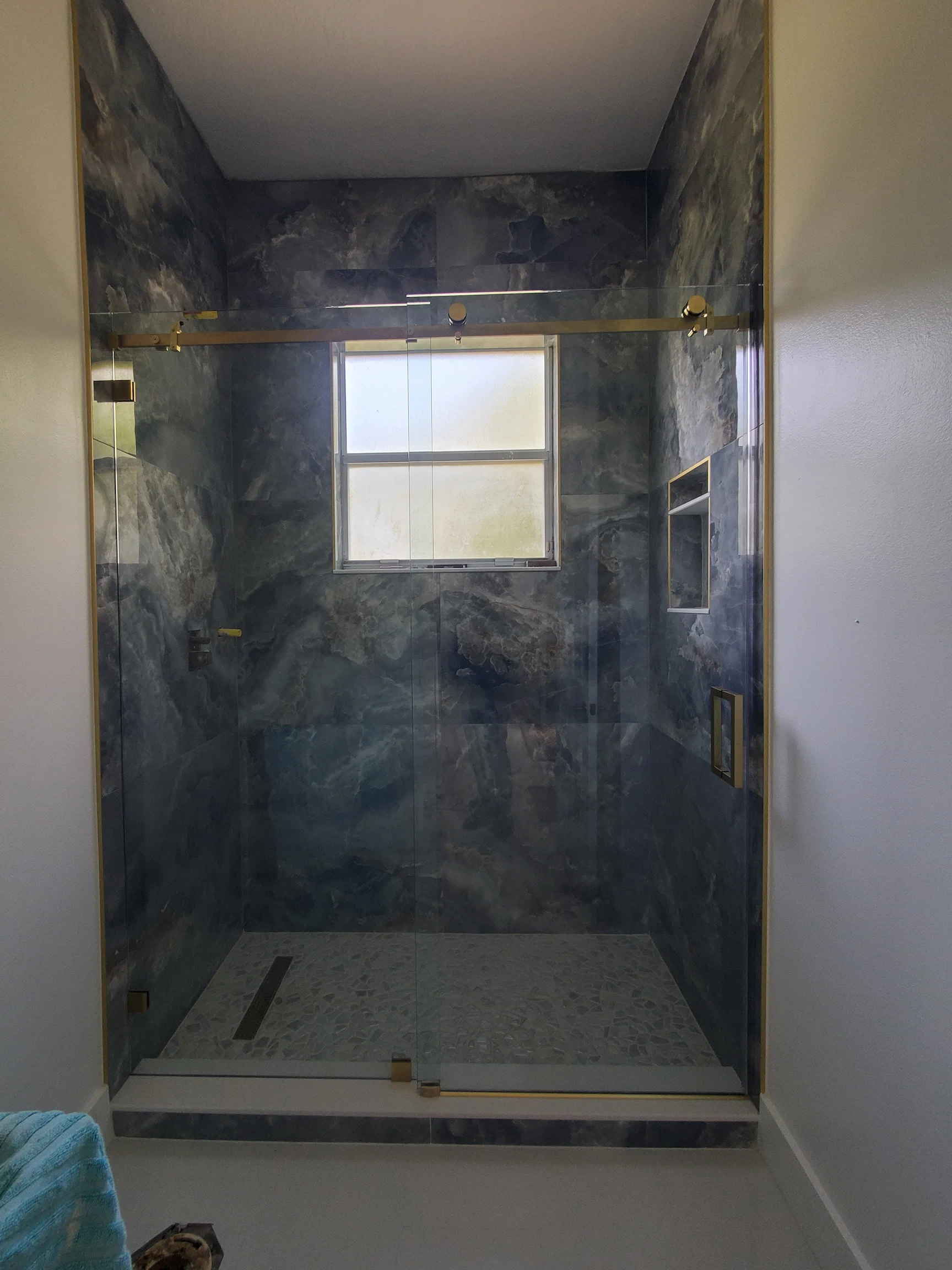For this stylish bathroom upgrade in West Palm Beach, FL, we installed a frameless Serenity-style sliding shower enclosure. Featuring clean lines and a luxurious satin brass finish, this system adds both function and elegance to the space.