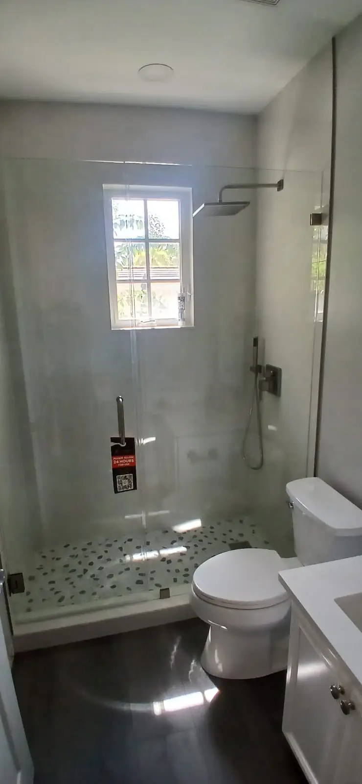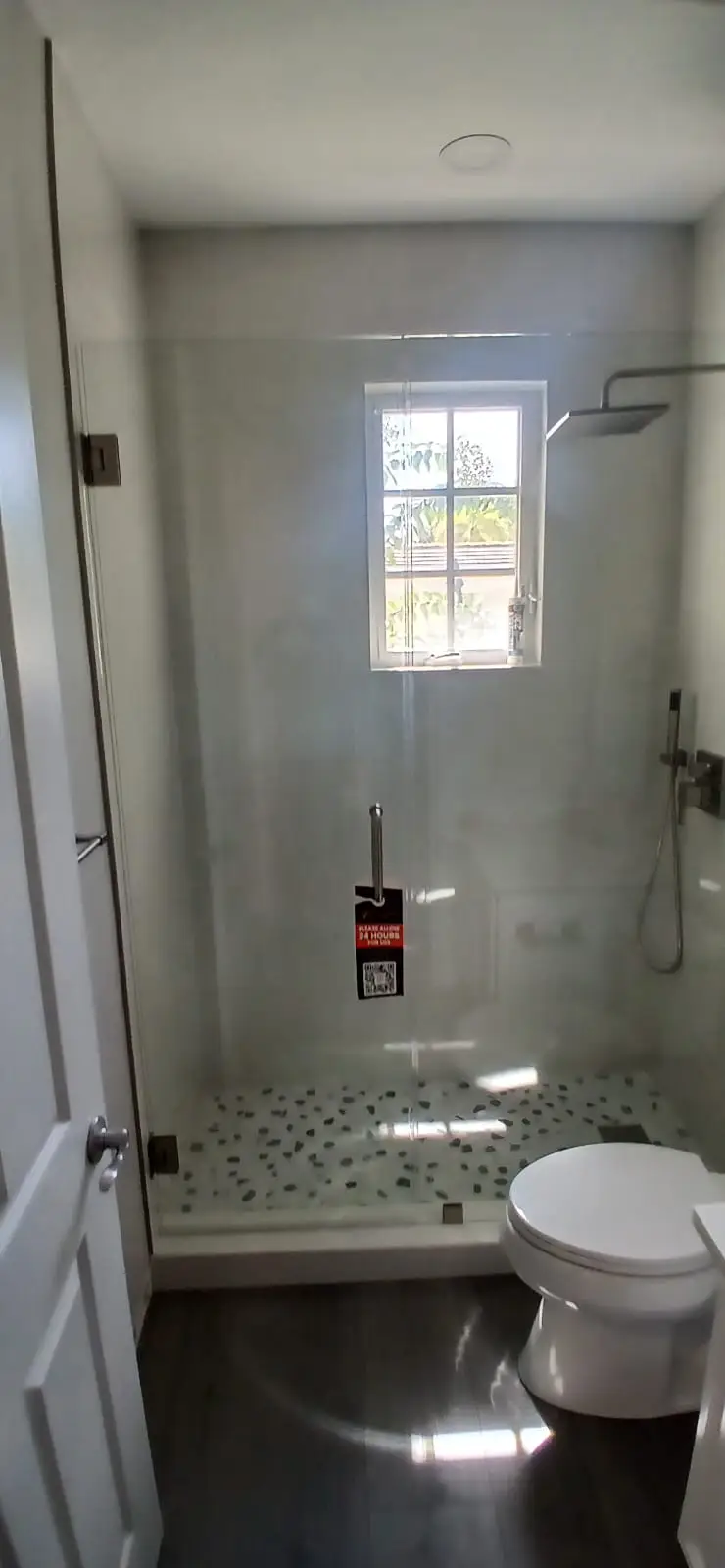 This project in Jupiter, FL, involved the precise installation of a custom frameless shower door and panel. Crafted with 3/8” clear monolithic tempered glass and brushed nickel hardware, the enclosure combines modern elegance with functionality. All final measurements were meticulously taken on-site to ensure a seamless fit, and special attention was given to proper alignment and finishing details.