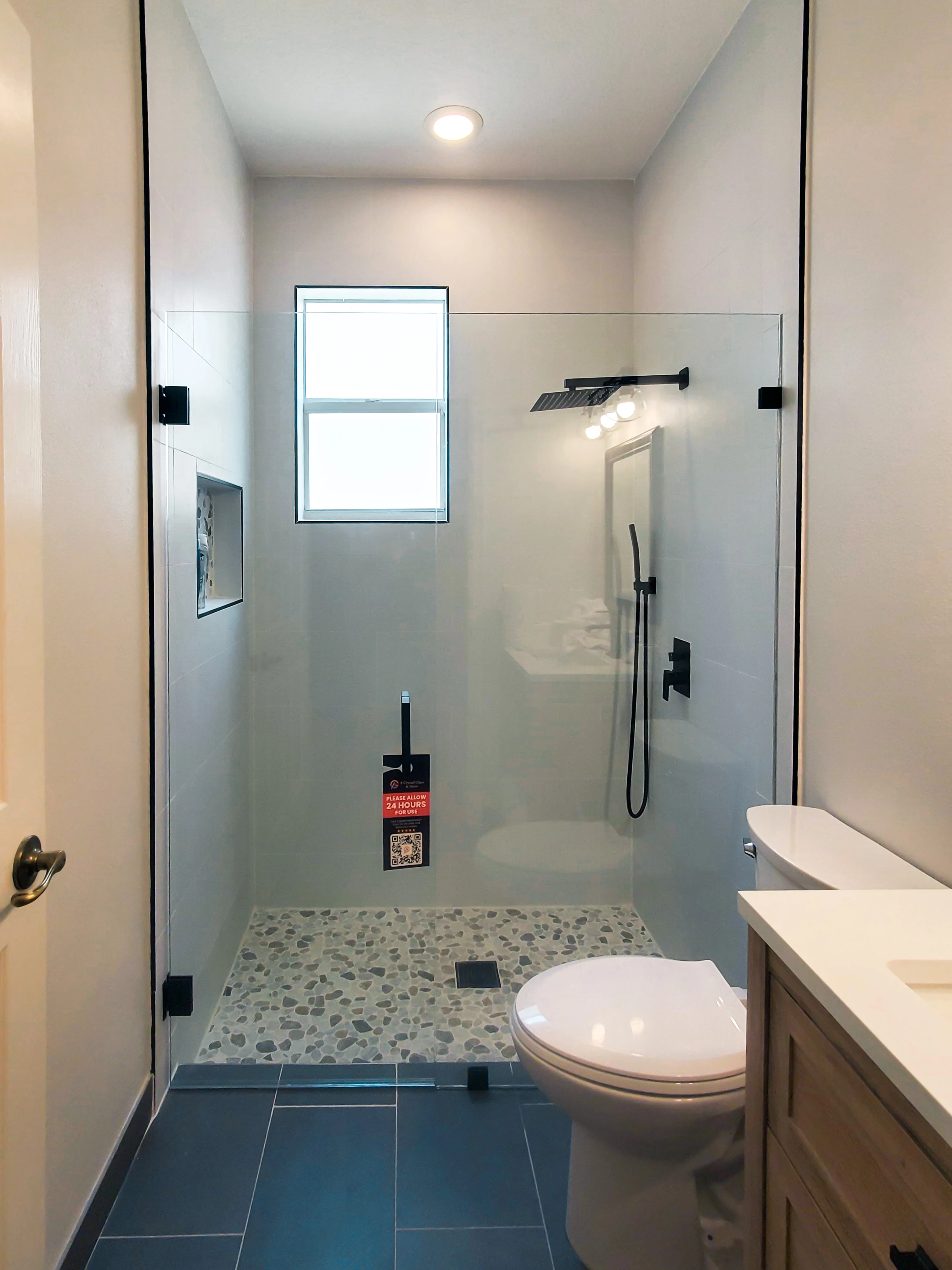 This project in Palm Beach Gardens, FL, showcases a frameless shower enclosure crafted with 3/8" clear tempered glass. The design is highlighted with a matte black hardware finish, creating a bold, modern statement in the bathroom. Sized at approximately 59 11/16" x 76", it delivers both durability and a sleek aesthetic for everyday use.
