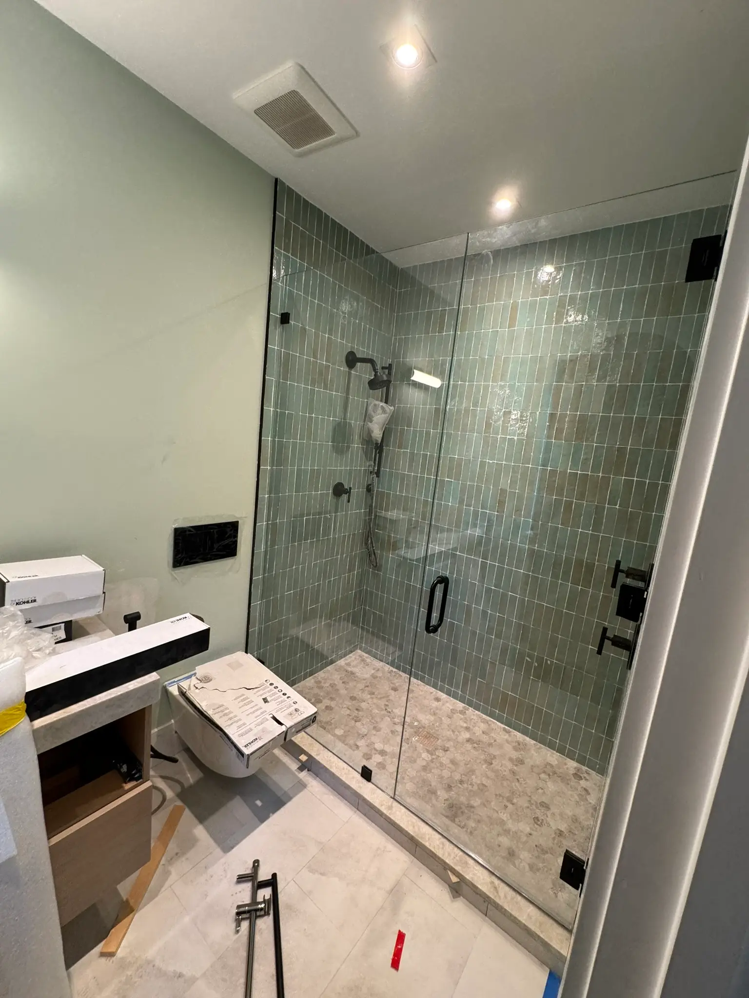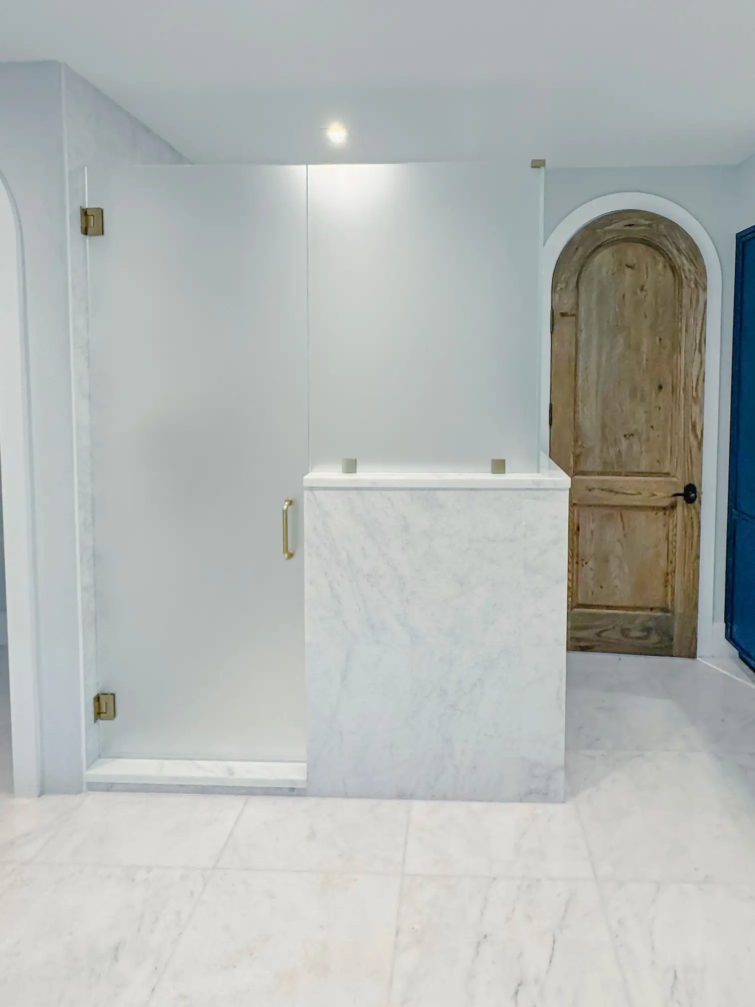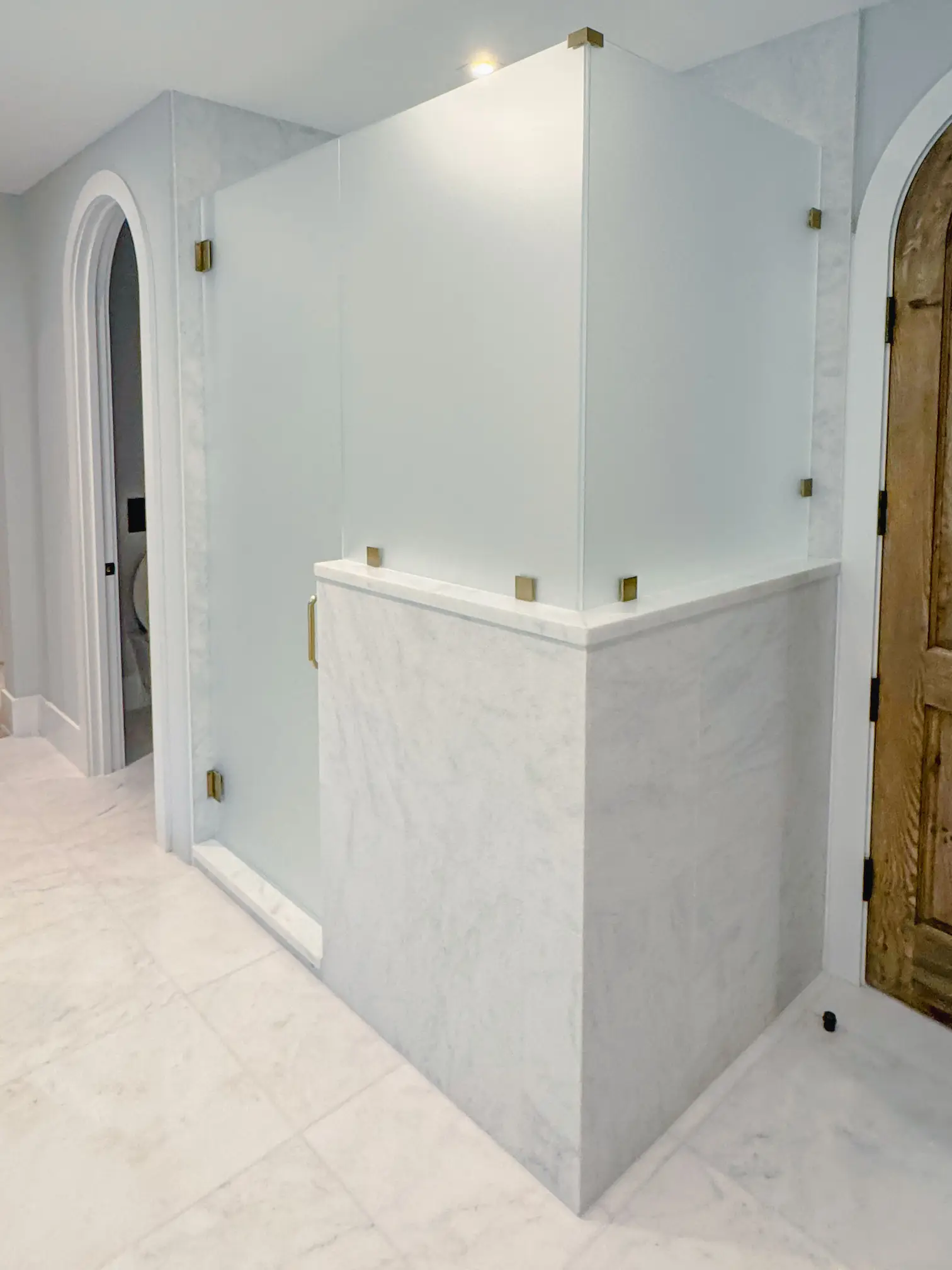 All enclosures were crafted using ½” low iron tempered glass, ensuring superior clarity and a clean, modern appearance. The Master Bath features acid-etched glass for a soft, frosted finish and enhanced privacy, paired with brushed bronze hardware (pending customer approval). The Gym Bath and Meditation Bath both include black hardware, offering a bold and elegant contrast to the clear low-iron glass.