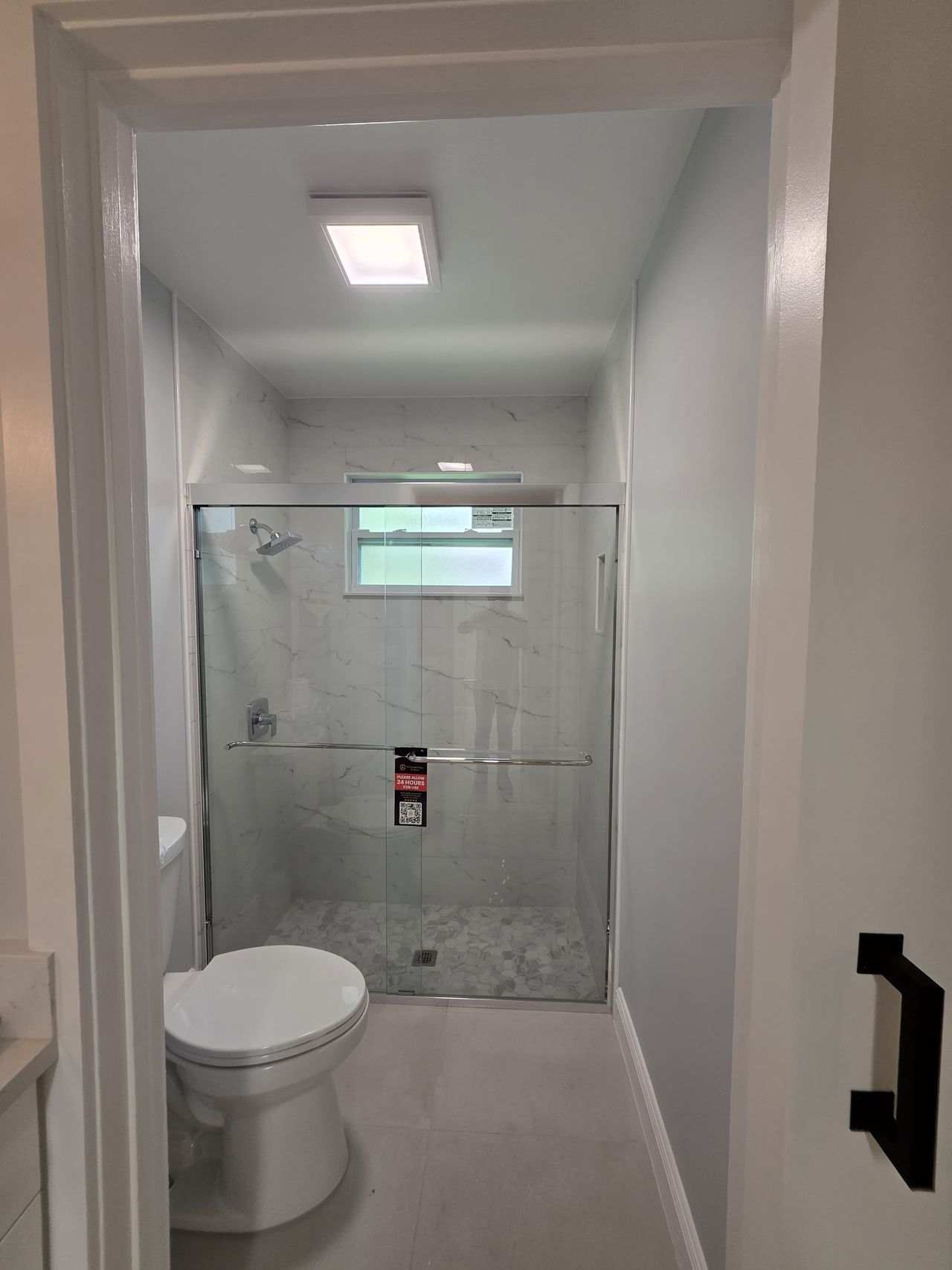 We installed two custom bypass shower enclosures fabricated with 3/8” clear monolithic tempered glass. The sliding configuration helps maximize usable space while keeping each bathroom open and efficient.