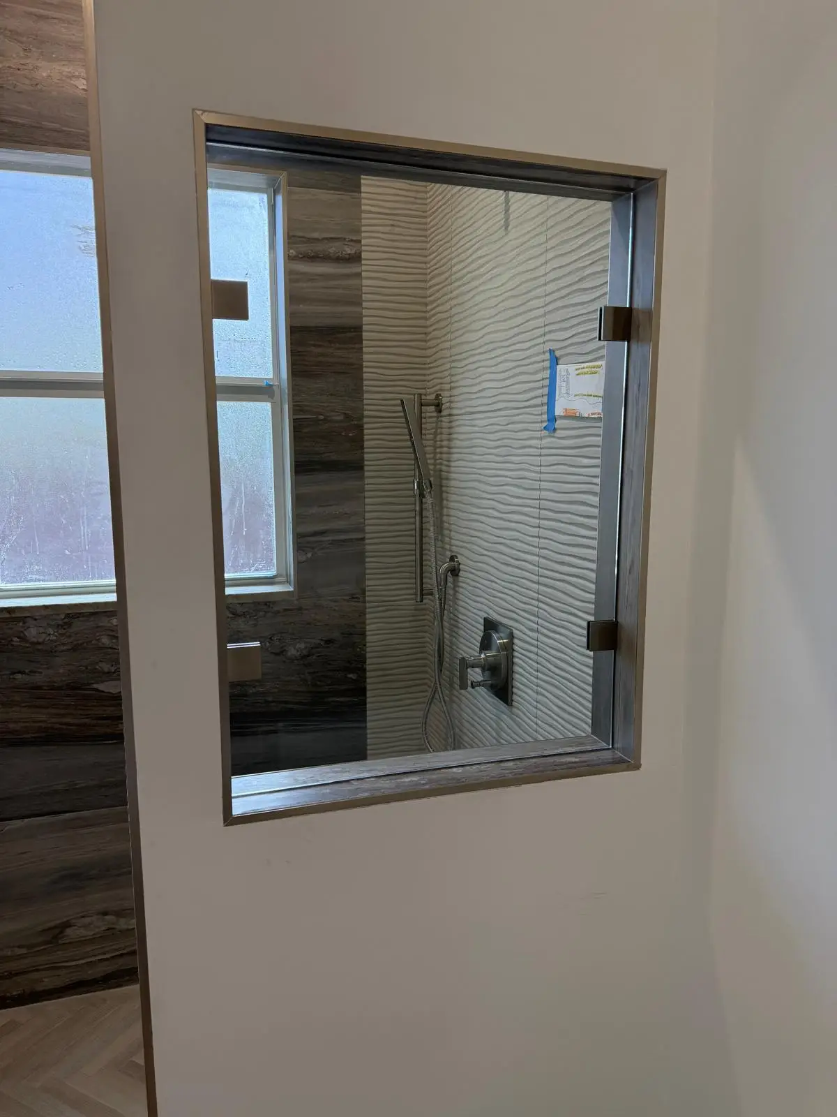 In the master bath, a sleek splash guard was installed using 3/8” clear tempered glass and brushed nickel hardware, offering a minimalist, open feel while maintaining water protection and durability. In the son’s bathroom, a custom shower window was added to allow natural light to flow through the space, complementing the overall modern design.