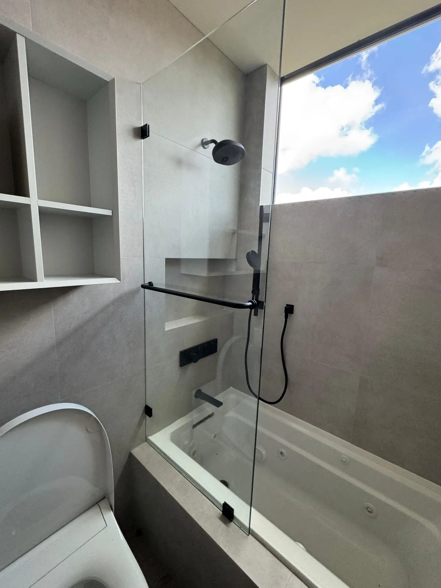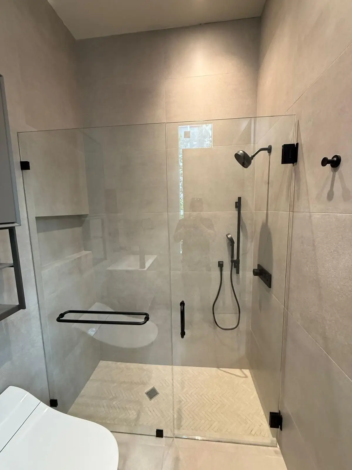 Every space received precise measurements on-site to ensure a perfect fit, with all enclosures finished in elegant matte black hardware. Functional accessories such as round handles and back-to-back towel bars were seamlessly integrated to combine style and practicality.
