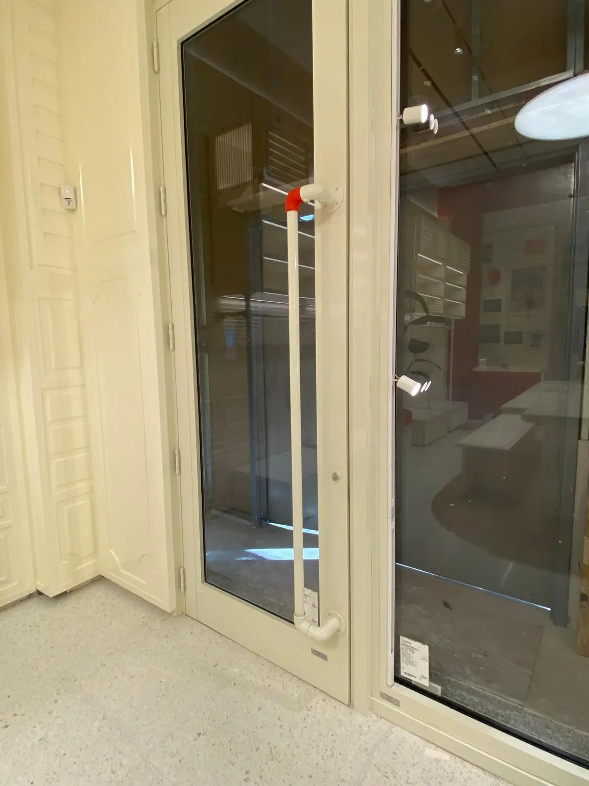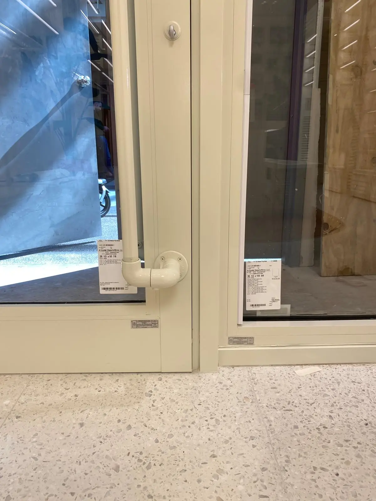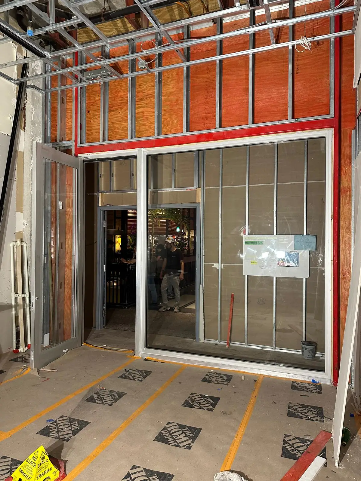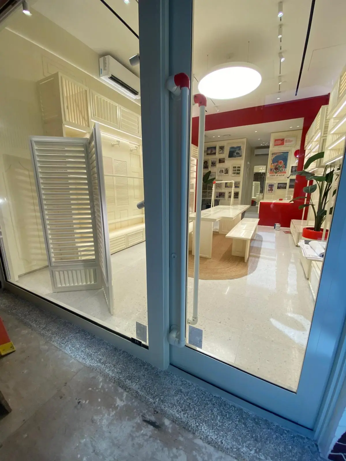 The storefront was constructed using the Aldora FS300 Maximum View Storefront System along with an Aldora Summit Series inswing door, all finished in an elegant Spanish White (RAL 210-2) custom color. The installation included premium hardware such as 60” offset custom push/pull handles, an overhead concealed door closer, and a fixed side lite configuration for a refined and functional entrance.