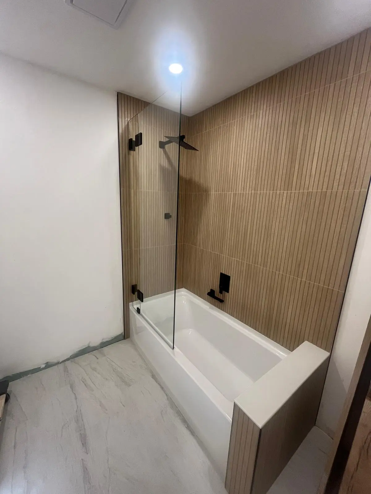 All final measurements were meticulously taken on-site to ensure seamless integration, while the enclosure was installed with careful attention to detail, including hand-applied silicone and a bottom sweep to support proper door alignment. Though frameless by design, the enclosure maintains functional durability and a refined aesthetic, enhancing the overall bathroom space.